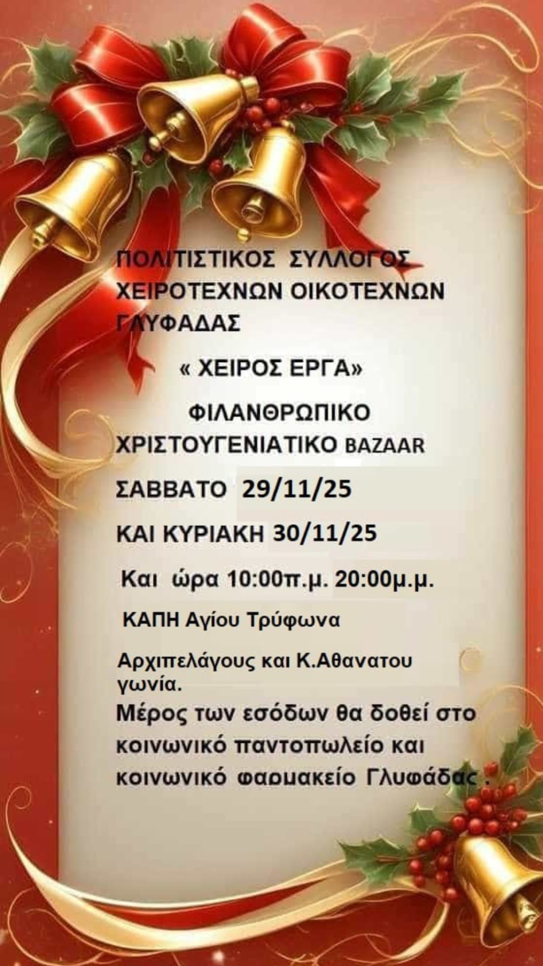 Η ωραιότερη γιορτή του χρόνου πλησιάζει και το επόμενο Σαββατοκύριακο διοργανώνεται στον Δήμο Γλυφάδας ένα μπαζάρ γεμάτο ζεστασιά, δημιουργία και αλληλεγγύη.