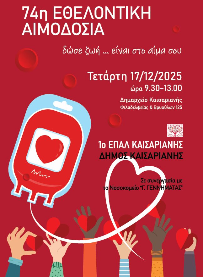 Την Τετάρτη 17 Δεκεμβρίου στον φιλόξενο χώρο της αίθουσας εκδηλώσεων του Δημαρχείου Καισαριανή, ο Δήμος και το 1ο ΕΠΑΛ Καισαριανής διοργανώνουν την 74η Εθελοντική Αιμοδοσία, με σύνθημα το «ένας θεσμός… ζωής!*».