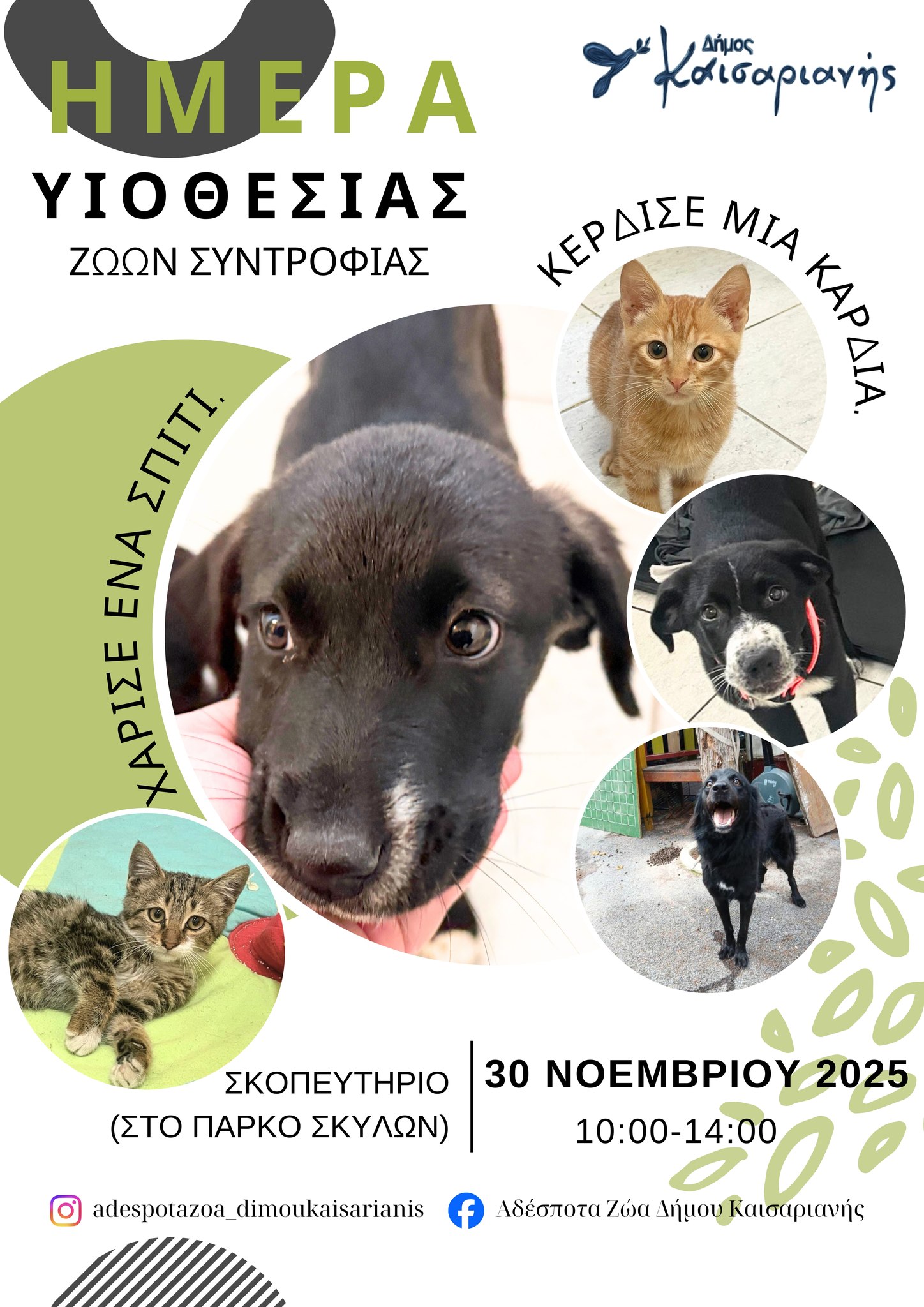 Η Υπηρεσία για τα Αδέσποτα Ζώα του Δήμου Καισαριανής διοργανώνει μία Ημέρα Υιοθεσίας, για τα σκυλάκια και τα γατάκια της πόλης που βρίσκονται στην φροντίδα του Δήμου που αναζητούν την παντοτινή τους οικογένειά, με την περιγραφή «Χαλαρή Κυριακή, Χνουδωτές Αγκαλιές και Καφές».