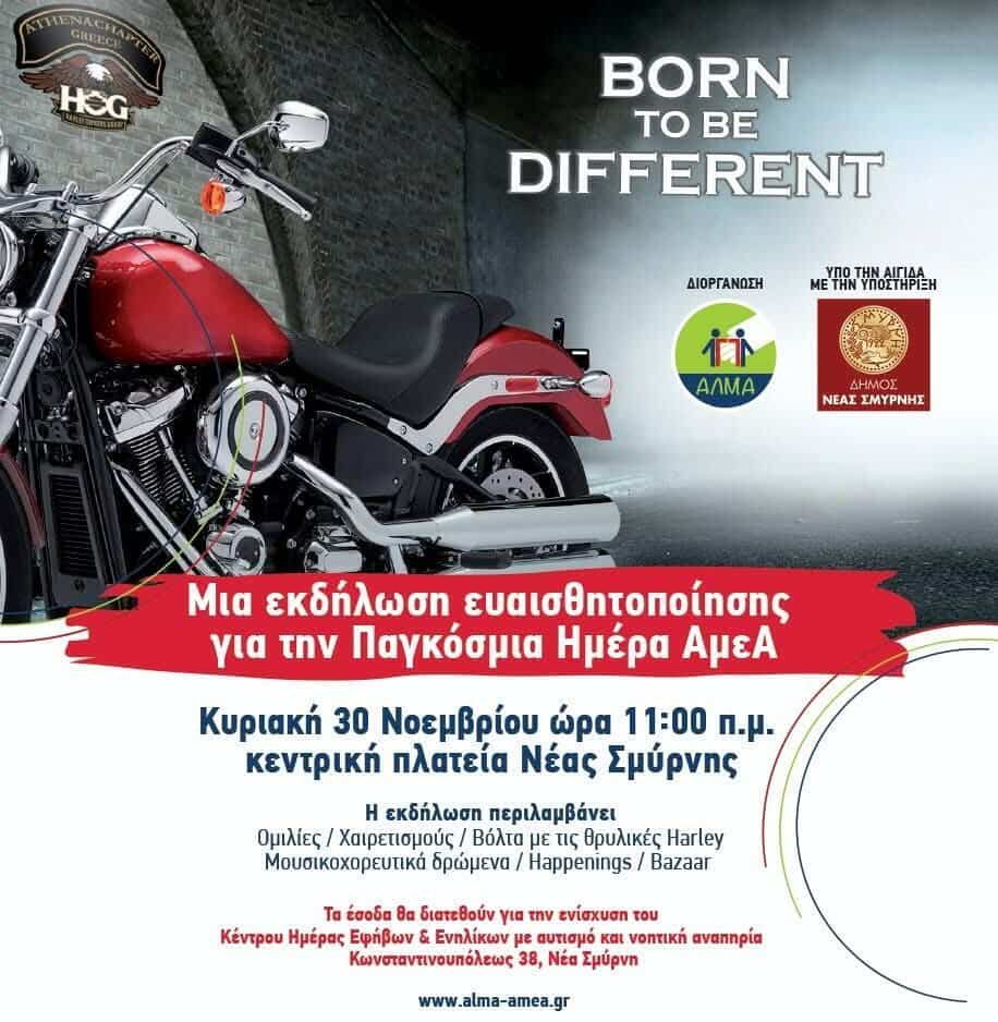 Με αφορμή την Παγκόσμια Ημέρα Ατόμων με Αναπηρία, ο Σύλλογος ΑΛΜΑ και το επίσημο παράρτημα της Harley Davidson στην Αθήνα (HOG Athens Chapter) διοργανώνουν, με την υποστήριξη του Δήμου Νέας Σμύρνης, μία εκδήλωση ευαισθητοποίησης και ενημέρωσης.