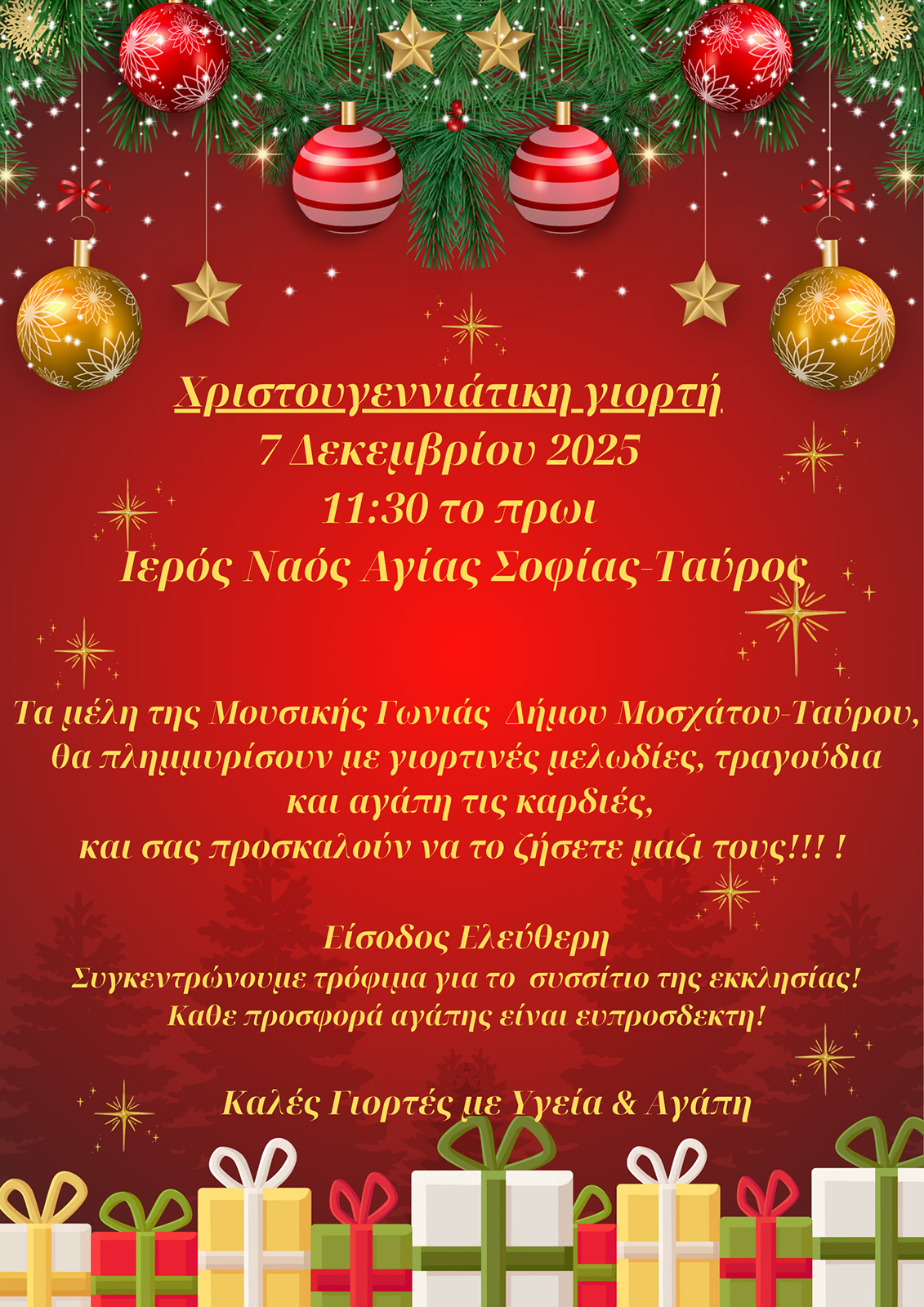 Την Κυριακή 7 Δεκεμβρίου 2025, στις 11:30 π.μ., στον Ιερό Ναό Αγίας Σοφίας στον Ταύρο, τα μέλη της «Μουσικής Γωνιάς» θα παρουσιάσουν ένα ξεχωριστό χριστουγεννιάτικο μουσικό πρόγραμμα, με ελεύθερη είσοδο.
