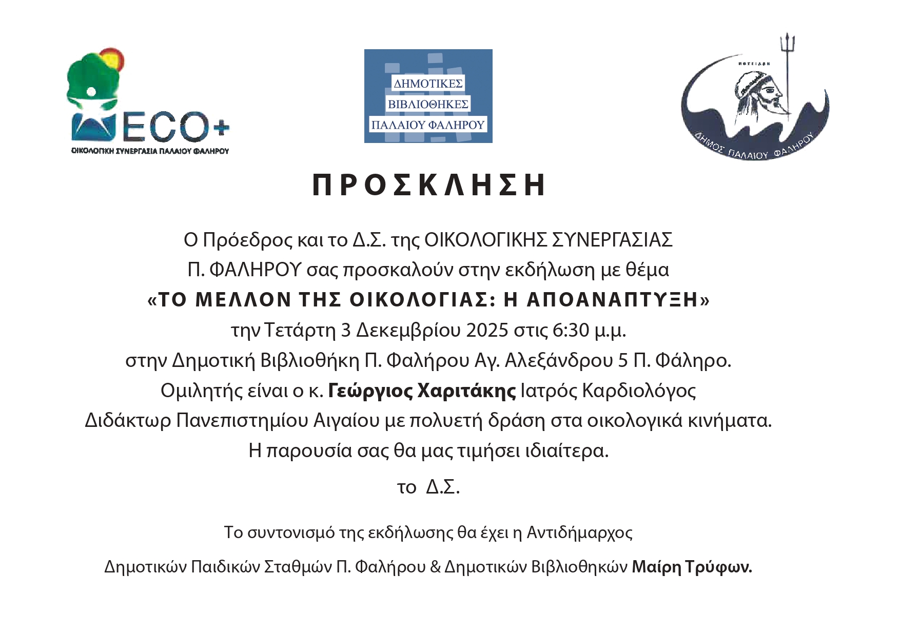 Η Οικολογική Συνεργασία Παλαιού Φαλήρου διοργανώνει μία εκδήλωση με θέμα «Το μέλλον της οικολογίας: Η αποανάπτυξη», με ομιλητή τον Γεώργιο Χαριτάκη, ιατρό Καρδιολόγο και διδάκτωρ του Πανεπιστημίου Αιγαίου.