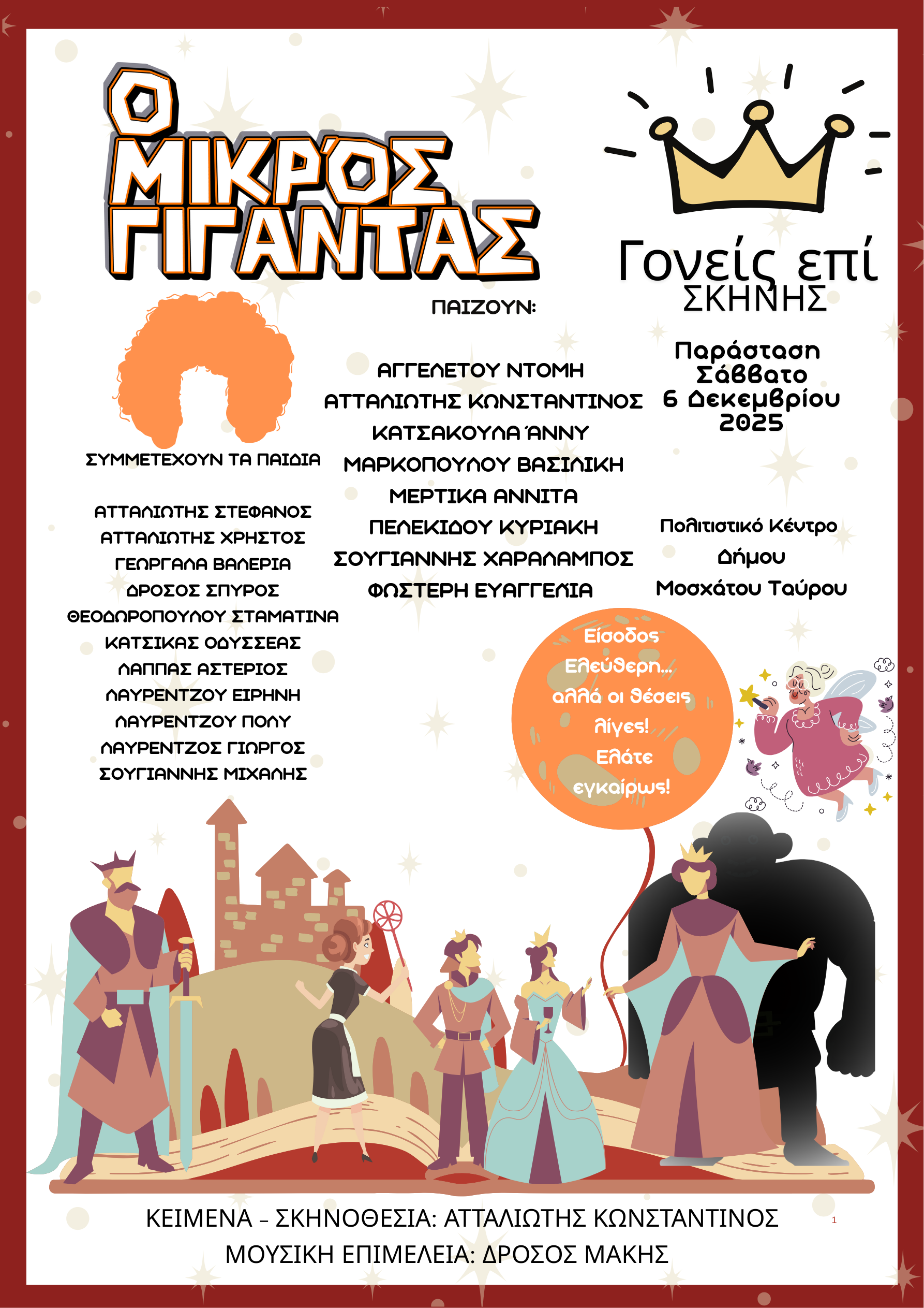 Μια παιδική θεατρική παράσταση με διδακτικό χαρακτήρα «Ο Μικρός Γίγαντας» από την ομάδα Γονείς επί Σκηνής φιλοξενείται στο Πολιτιστικό Κέντρο «Θεόδωρος Αγγελόπουλος» του Δήμου Μοσχάτου – Ταύρου.