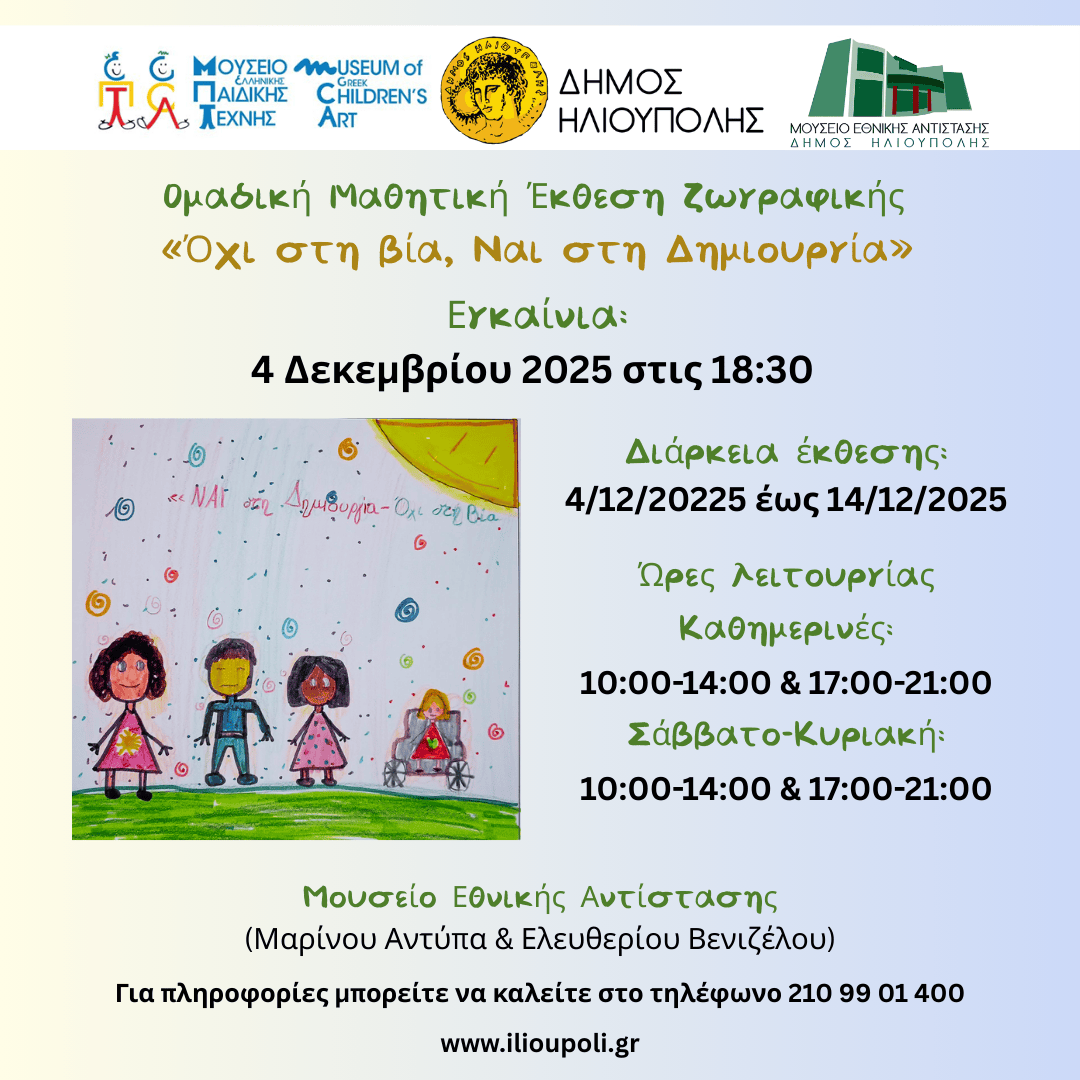 Στο Μουσείο Εθνικής Αντίστασης θα φιλοξενηθεί η ομαδική έκθεση ζωγραφικής μαθητών/τριών από Δημοτικά σχολεία της Ηλιούπολης (1ο, 2ο, 4ο, 5ο, 8ο, 11ο, 12ο, 13ο, 15ο, 17ο, 20ο ) και του Υμηττού (1ο & 2ο), με τίτλο: «Όχι στη Βία, Ναι στη Δημιουργία», με ελεύθερη είσοδο.