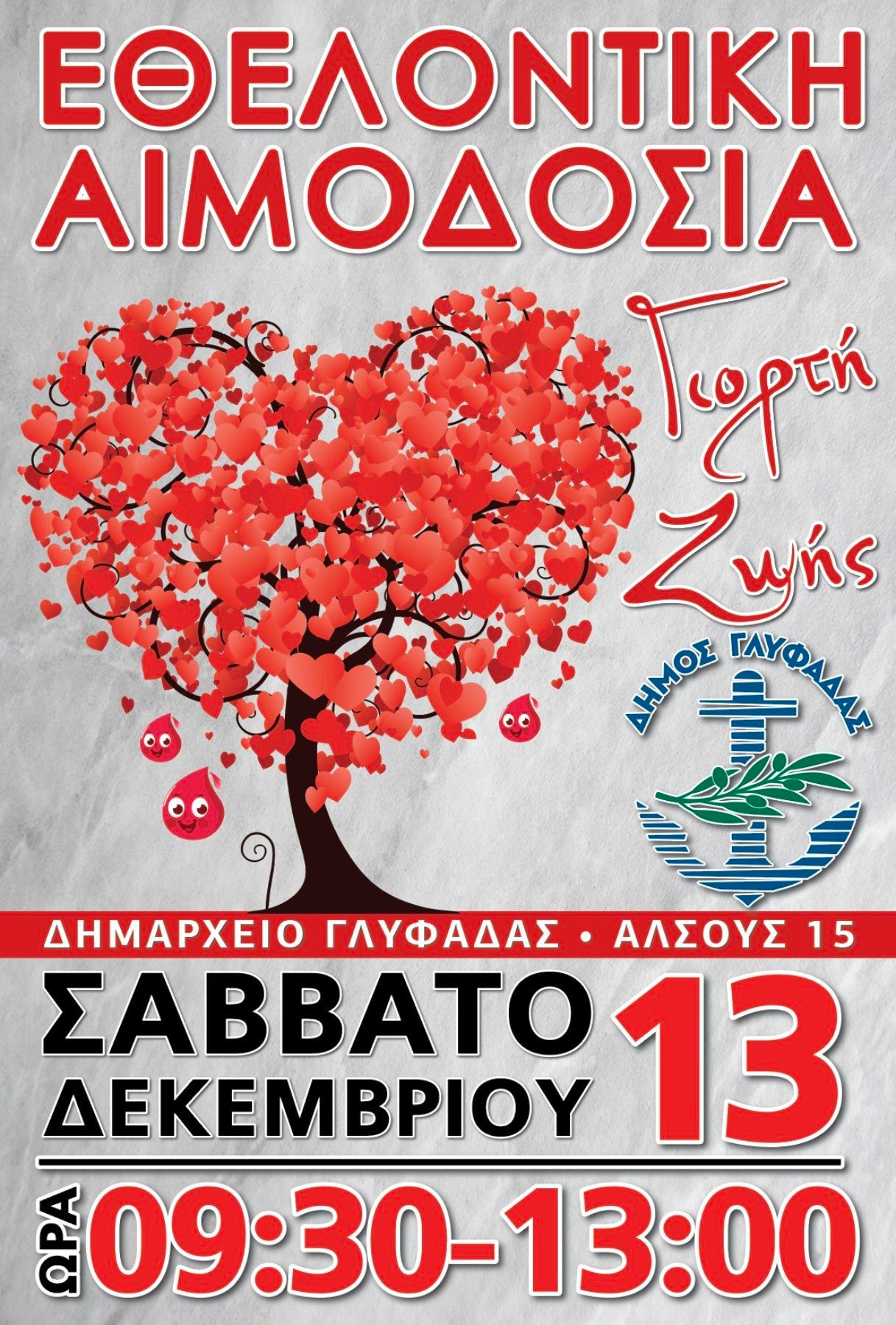 Η αιμοδοσία του Δήμου Γλυφάδας, η οποία πραγματοποιείται σε συνεργασία με το Ασκληπιείο Βούλας, θα διενεργηθεί στο ισόγειο του Δημαρχείου (Άλσους 15, Γλυφάδα), το Σάββατο 13 Δεκεμβρίου, 9:30 π.μ. – 1:00 μ.μ..