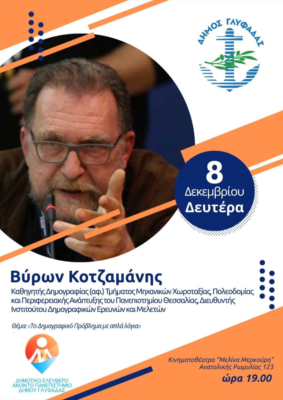Συνεχίζονται οι διαλέξεις στο Δημοτικό Ελεύθερο Ανοικτό Πανεπιστήμιο (ΔΕΑΠ) Γλυφάδας, με την επόμενη διάλεξη να φέρει τον τίτλο «Το Δημογραφικό Πρόβλημα με απλά λόγια», που θα πραγματοποιηθεί σήμερα, Δευτέρα 8 Δεκεμβρίου, 7:00 μ.μ., στο Δημοτικό Κινηματοθέατρο «Μ. Μερκούρη» (Γ.Γεννηματά και Ανατ. Ρωμυλίας 123), με ελεύθερη είσοδο.