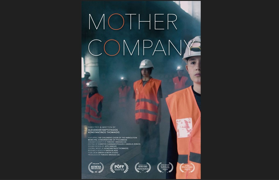 Το Mother Company αποτυπώνει τα βιώματα ανθρώπων που έζησαν μέσα και δίπλα στα εργοστάσια και τα ορυχεία λιγνίτη της Β. Ελλάδας μέσα από χορωδιακή μουσική και τις φωνές των παιδιών της περιοχής. Το πειραματικό ντοκιμαντέρ μικρού μήκους (18′) ακολουθεί μια τοπική χορωδία, εγκλωβισμένη μέσα σε ένα εγκαταλελειμμένο εργοστάσιο, να τραγουδά, να προβληματίζεται και να έρχεται αντιμέτωπη με θέματα όπως η οικονομική ανάπτυξη, η οικολογική και υγειονομική καταστροφή αλλά και οι επιπτώσεις της πρόσφατης απολιγνιτοποίησης.
