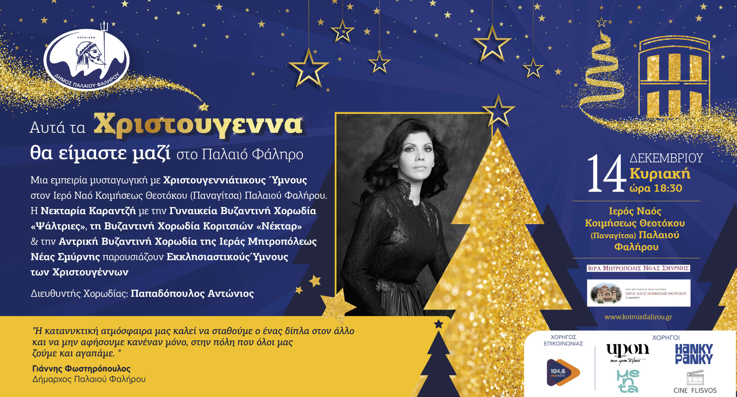 Η μοναδική συναυλία θα λάβει χώρα την Κυριακή 14 Δεκεμβρίου, στις 6:30 μ.μ., στον Ιερό Ναό Κοιμήσεως Θεοτόκου (Παναγίτσα) Παλαιού Φαλήρου.