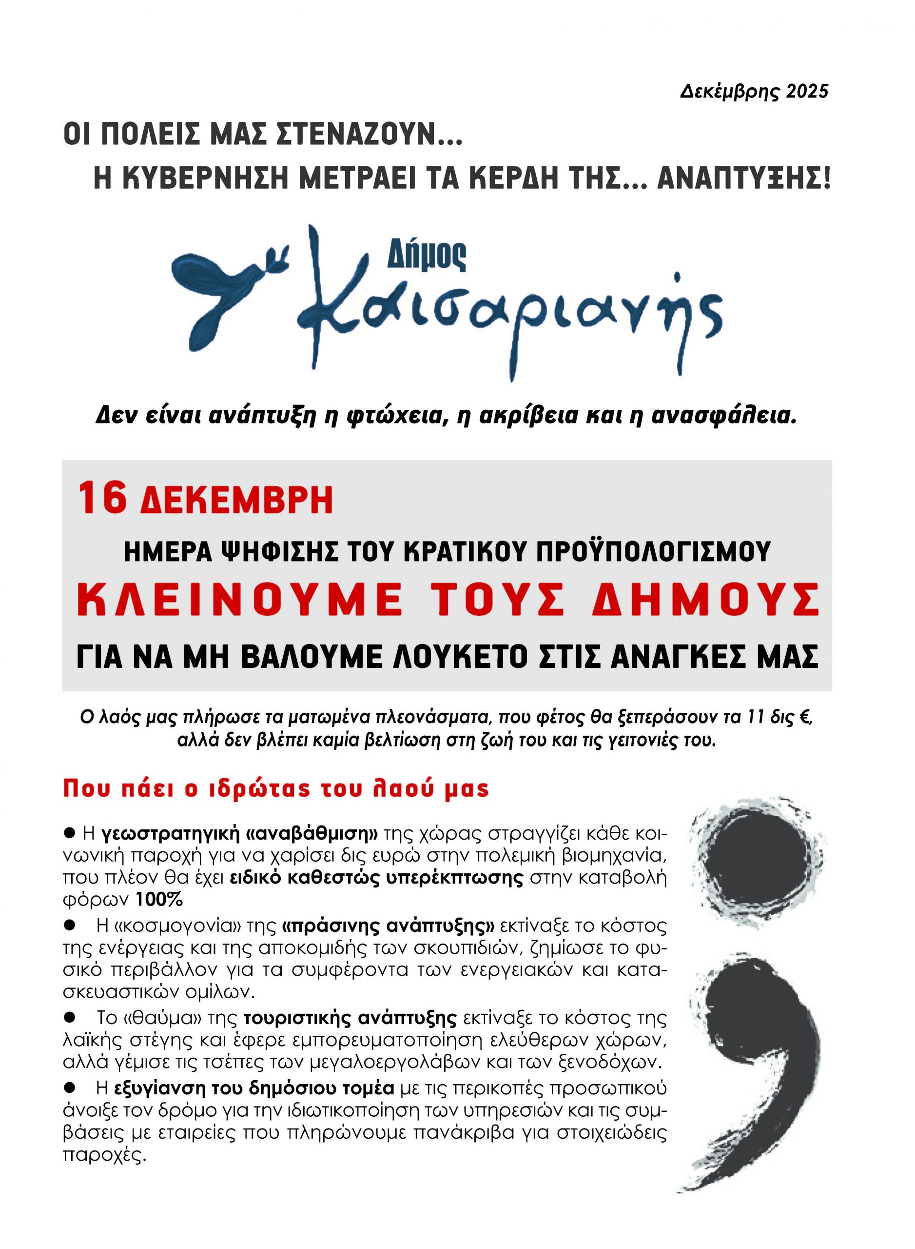Ο δήμαρχος Καισαριανής ανακοίνωσε, επίσης, την πραγματοποίηση ανοιχτής συγκέντρωσης στις 10 το πρωί της 16ης Δεκέμβρη στην πλατεία Παναγιώτη Μακρή και την συμμετοχή στο συλλαλητήριο της ΚΕΔΕ στο Σύνταγμα, της ίδιας μέρας στις 12:00.