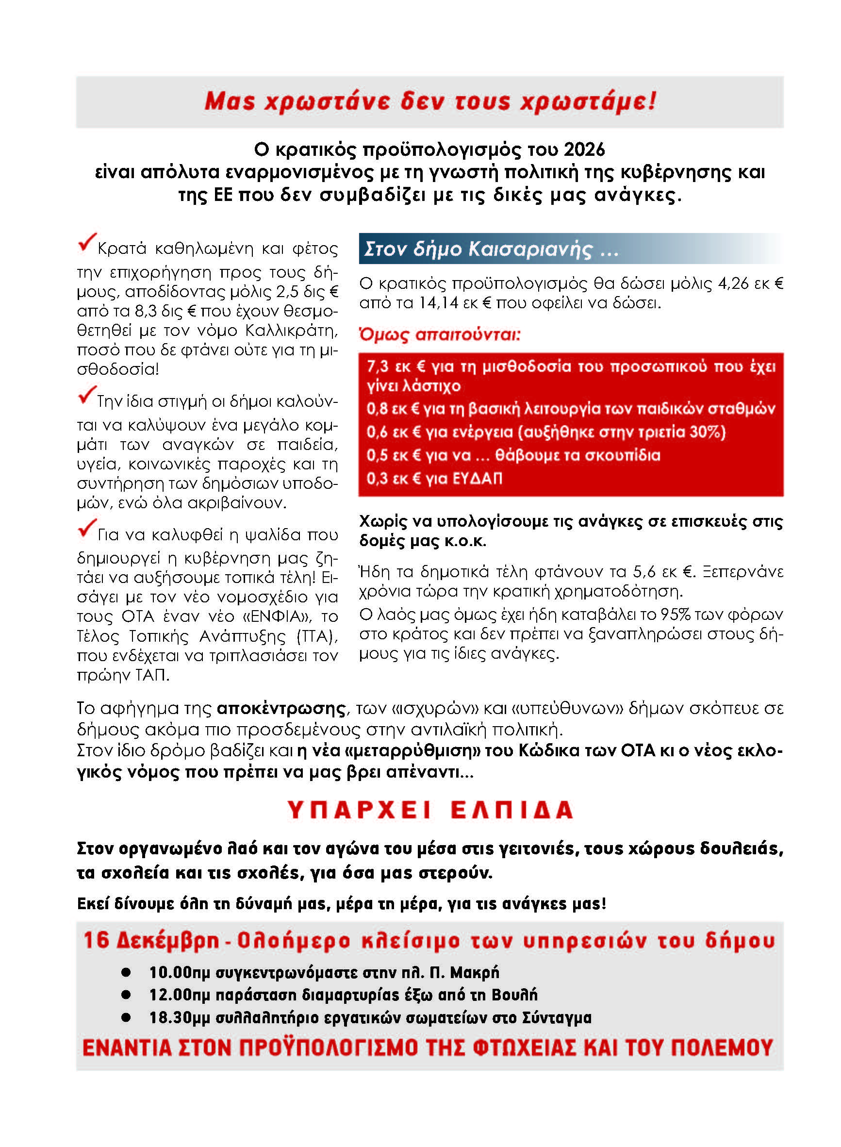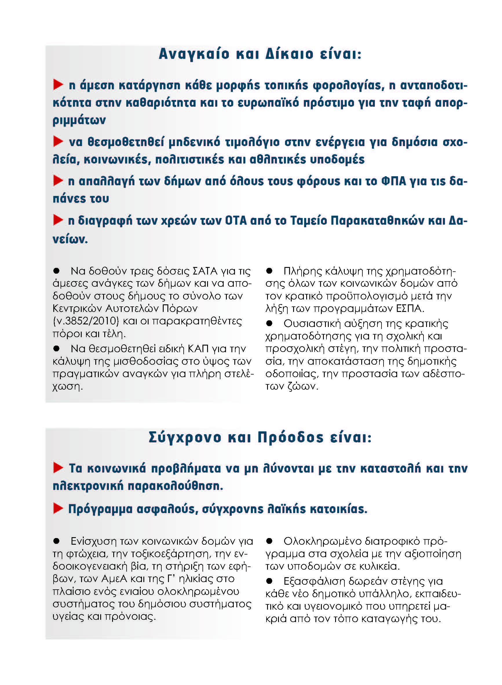 • Απαιτούμε να δοθούν κατ’ ελάχιστο όσα είναι θεσμοθετημένα! Συνεχίζουμε στον δρόμο των διεκδικήσεων και των κινητοποιήσεων του προηγούμενου διαστήματος για: αναγκαίους πόρους, μόνιμο προσωπικό, μέσα, την κατάργηση των δημοτικών τελών. Να φορολογηθεί το μεγάλο κεφάλαιο και να διατεθούν κονδύλια σε Παιδεία, Υγεία, Τοπική Διοίκηση με βάση τις σύγχρονες ανάγκες.