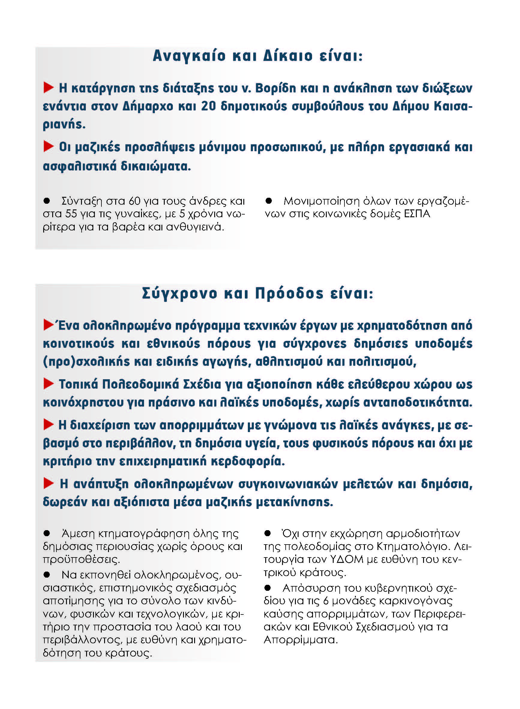 • Με τη λεγόμενη «μεταρρύθμιση της Αυτοδιοίκησης» που έδωσε στη δημοσιότητα η κυβέρνηση, για άλλη μια φορά με τον μανδύα της «διαφάνειας» αποσκοπεί στην πιο αποτελεσματική υλοποίηση της αντιλαϊκής πολιτικής και τη λειτουργία των δήμων με βάση την πολεμική οικονομία. Ο εκλογικός νόμος που σχεδιάζεται είναι καλπονοθευτικός, αφού οι δημότες καλούνται να ψηφίσουν ταυτόχρονα δύο συνδυασμούς από την πρώτη Κυριακή, ενώ προβλέπεται καθολική ηλεκτρονική ψηφοφορία.