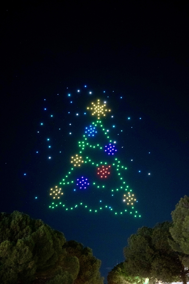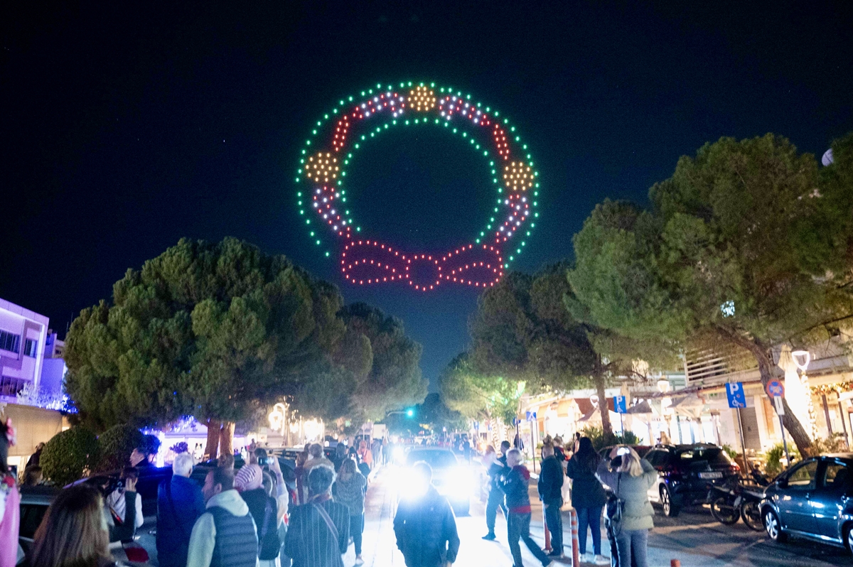 Ειδικότερα, στις 20:00, τα drones φώτισαν τον ουρανό, παρουσιάζοντας ένα φαντασμαγορικό υπερθέαμα με χριστουγεννιάτικα σχέδια, συμβολισμούς και ευχές του Δήμου.