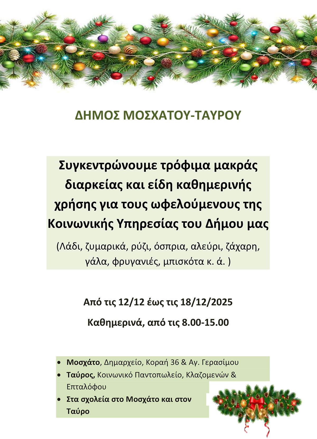 Τρόφιμα μακράς διαρκείας (λάδι, ζυμαρικά, ρύζι, όσπρια, αλεύρι, ζάχαρη, γάλα, φρυγανιές, μπισκότα, χυμό ντομάτας, κ.ά.) και είδη καθημερινής χρήσης συγκεντρώνει ο Δήμος Μοσχάτου-Ταύρου, για τους ωφελούμενους των προγραμμάτων των κοινωνικών υπηρεσιών του Δήμου καθώς και για την ενίσχυση του Kοινωνικού Παντοπωλείου.