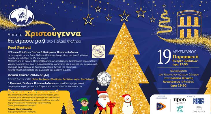 Οι χριστουγεννιάτικες εκδηλώσεις συνεχίζονται στον Δήμο Παλαιού Φαλήρου, με την φωταγώγηση του χριστουγεννιάτικου δέντρου στην Πλατεία Εθνικής Αντιστάσεως (Φλοίσβος), την Παρασκευή 19 Δεκεμβρίου, στις 19:30.