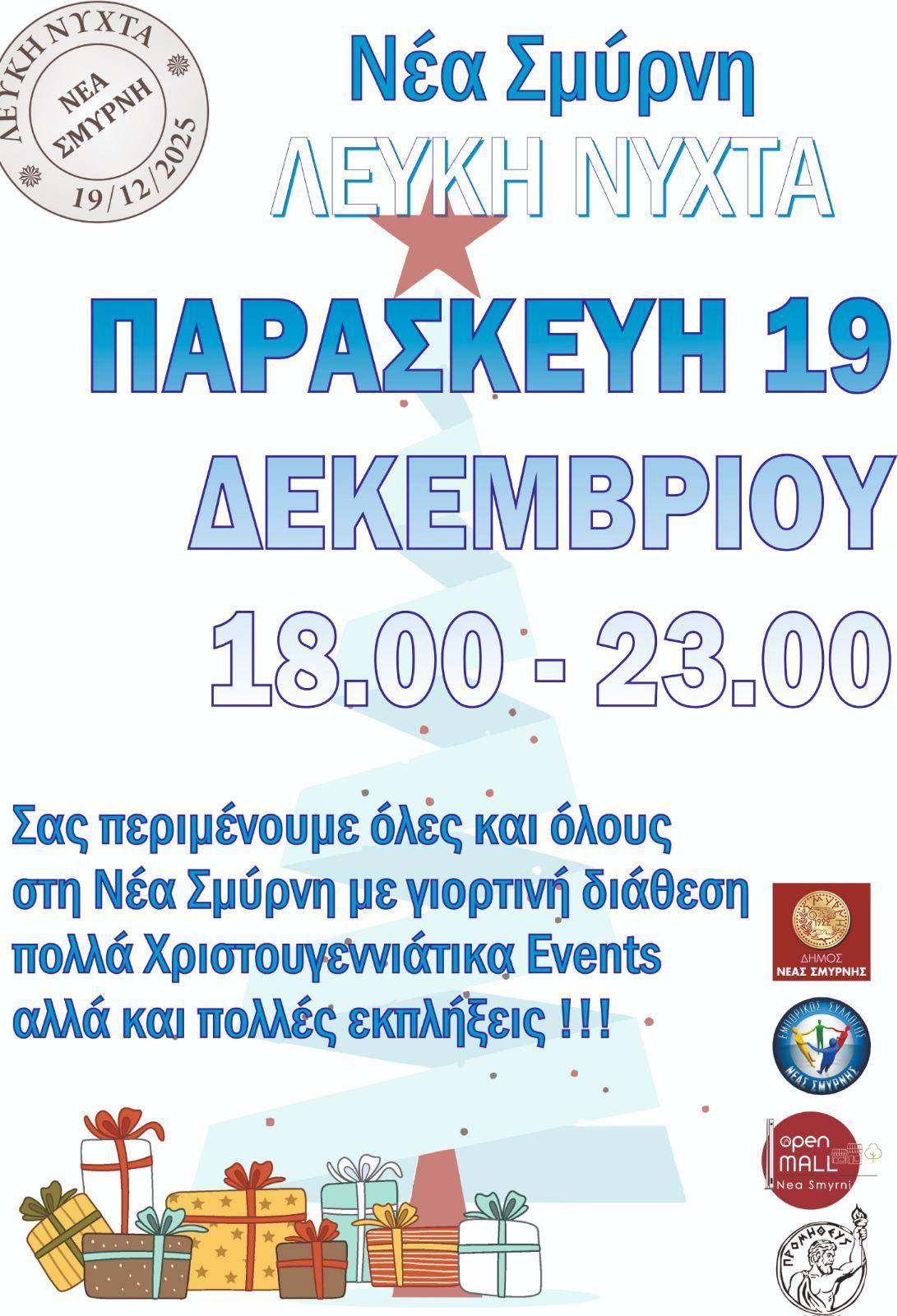 Ο Εμπορικός Σύλλογος Νέας Σμύρνης και ο Δήμος Νέας Σμύρνης διοργανώνουν τη «Λευκή Νύχτα» την Παρασκευή 19 Δεκεμβρίου, από τις 6:00 το απόγευμα μέχρι τις 11:30, στο κέντρο της πόλης.