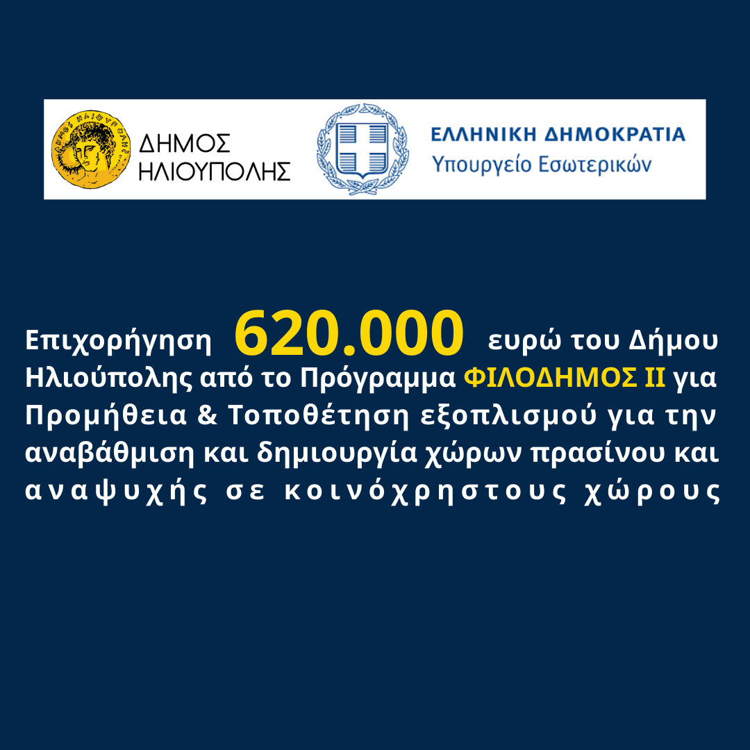 Σημαντική χρηματοδότηση ύψους 620.000 ευρώ εξασφάλισε ο Δήμος Ηλιούπολης από το Πρόγραμμα «ΦΙΛΟΔΗΜΟΣ ΙΙ», για την προμήθεια και τοποθέτηση εξοπλισμού με στόχο την αναβάθμιση και δημιουργία χώρων πρασίνου και αναψυχής σε κοινόχρηστους χώρους της πόλης.