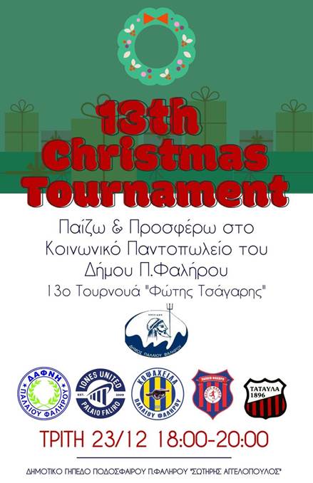 Το 13ο Christmas Tournament «Φώτης Τσάγαρης» διοργανώνουν τα αθλητικά Σωματεία της πόλης, σε συνεργασία με τον Δήμο Παλαιού Φαλήρου, που αποτελεί πλέον θεσμό για την πόλη, τιμώντας τη μνήμη του Φώτη Τσάγαρη και συνδυάζοντας τη χαρά του παιχνιδιού με την αξία της κοινωνικής προσφοράς.