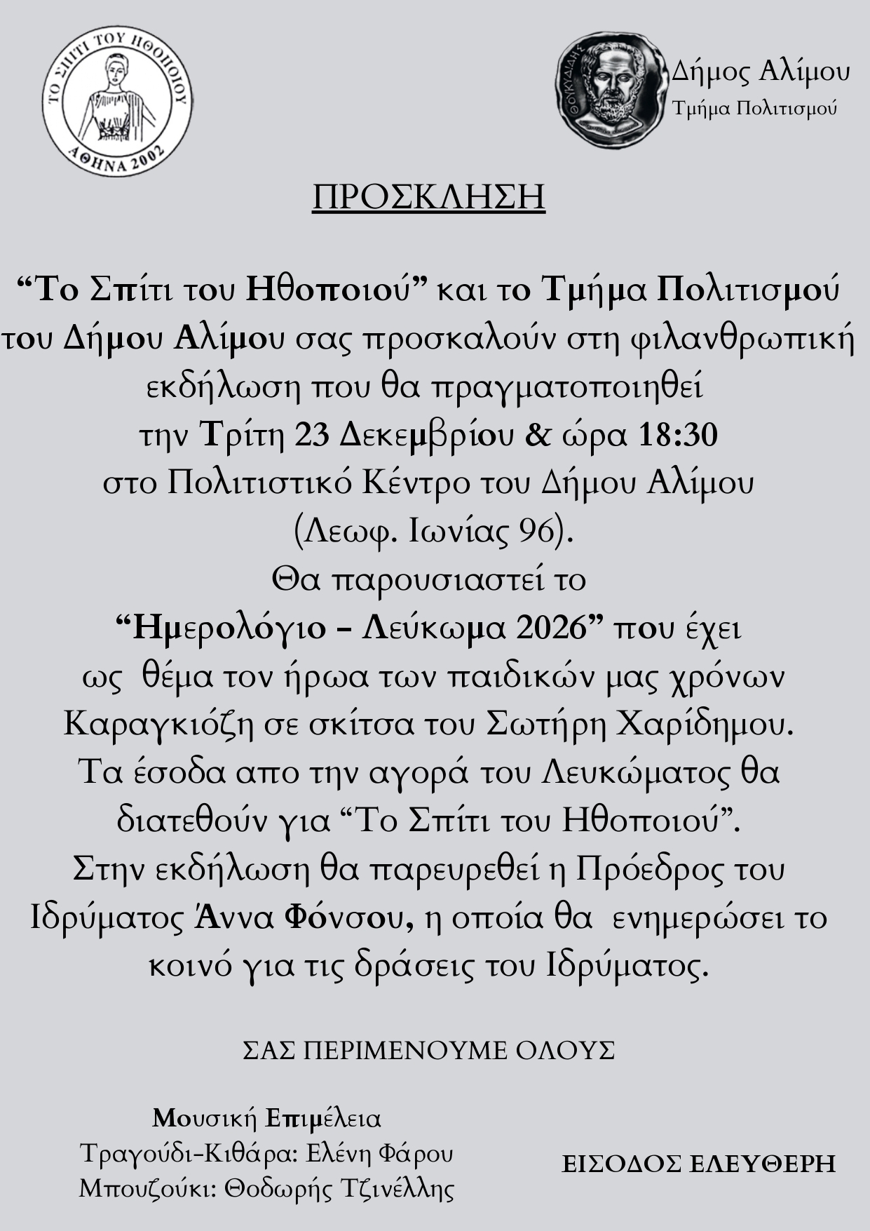 Το Ίδρυμα «Σπίτι του Ηθοποιού» και ο Δήμος Αλίμου, ενόψει των γιορτινών ημερών, διοργανώνουν μία φιλανθρωπική εκδήλωση, όπου θα παρουσιαστεί το «Ημερολόγιο – Λεύκωμα 2026», που έχει ως θέμα τον αγαπημένο ήρωα Καραγκιόζη, σε σκίτσα του Σωτήρη Χαρίδημου και σκηνοθεσία του Σωτήρη Χαριδήμου.