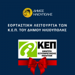 Το Σάββατο 27 Δεκεμβρίου 2025 και το Σάββατο 3 Ιανουάριου 2026, όλα τα Κ.Ε.Π. του Δήμου Ηλιούπολης θα παραμείνουν κλειστά.