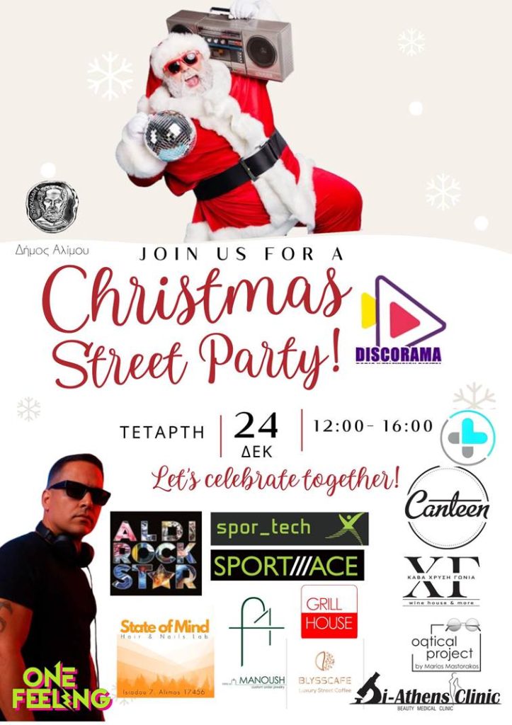 Ένα Χριστουγεννιάτικο Street Party διοργανώνουν τα καταστήματα του Άνω Καλαμακίου, στον Άλιμο ενόψει των εορτών, με ελληνικές και ξένες επιτυχίες των 80s-90s.