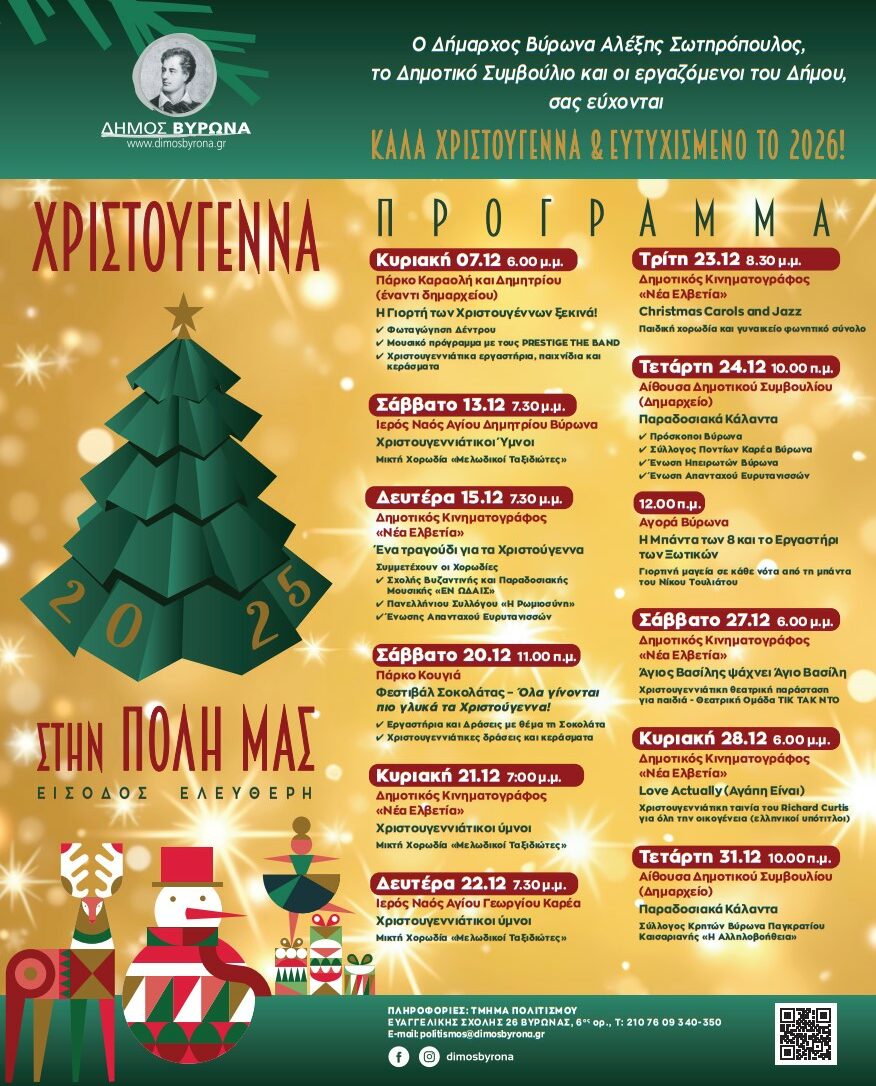 Ο Δήμος Βύρωνα, στο πλαίσιο των εορταστικών εκδηλώσεων «Χριστούγεννα στη πόλη μας», παρουσιάζει δύο πολιτιστικές εκδηλώσεις για το τελευταίο Σαββατοκύριακο του Δεκεμβρίου, στον Δημοτικό Κινηματογράφο «Νέα Ελβετία».