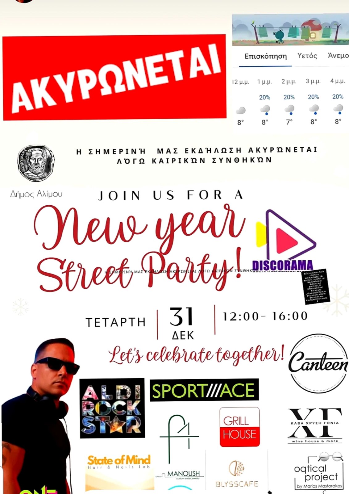 Με ανακοίνωση του ο Δήμος Αλίμου ενημερώνει πως η σημερινή προγραμματισμένη εκδήλωση των καταστημάτων στο Άνω Καλαμάκι αναβάλλεται λόγω καιρικών συνθηκών.