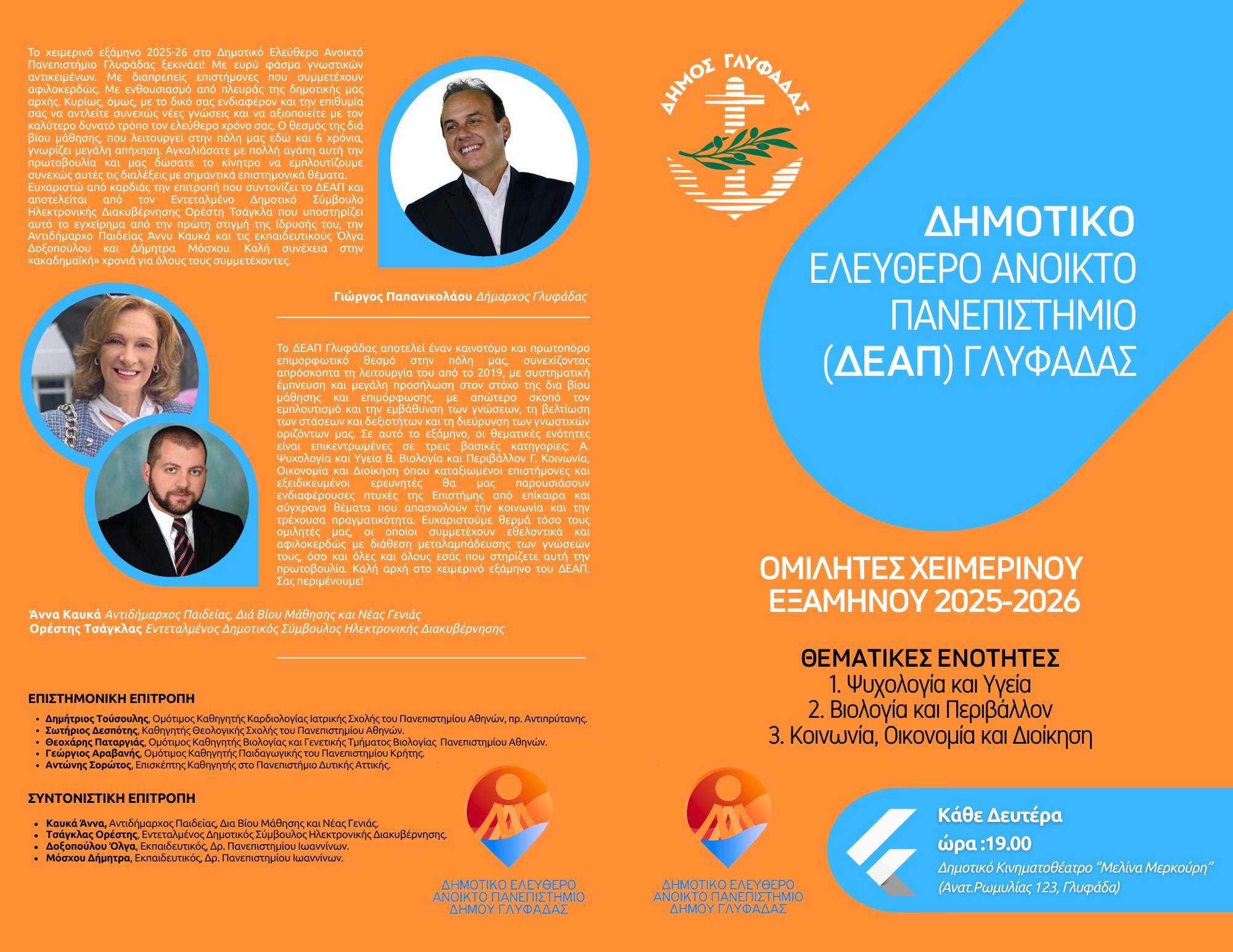 Ο θεσμός της Διά Βίου Μάθησης, που λειτουργεί στο Δήμο Γλυφάδας εδώ και έξι χρόνια, γνωρίζει µεγάλη απήχηση. Αγκαλιάσατε µε πολλή αγάπη αυτή την πρωτοβουλία και µας δώσατε το κίνητρο να εµπλουτίζουµε συνεχώς αυτές τις διαλέξεις µε σημαντικά επιστηµονικά θέµατα.