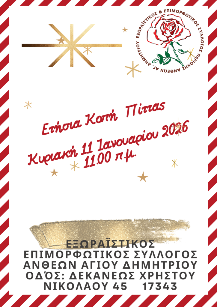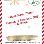 Ο Εξωραϊστικός Επιμορφωτικός Σύλλογος Ανθέων προσκαλεί όλους τους φίλους και τα μέλη στην ετήσια κοπή της πίτας, που θα λάβει χώρο την Κυριακή 11 Ιανουαρίου 2026, στις 11 π.μ., στον πολυχώρο του Συλλόγου.