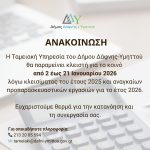 Η Ταμειακή Υπηρεσία του Δήμου Δάφνης-Υμηττού θα παραμείνει κλειστή έως και τις 21 Ιανουαρίου 2026, λόγω κλεισίματος του έτους 2025 και αναγκαίων προπαρασκευαστικών εργασιών για το νέο χρόνο.