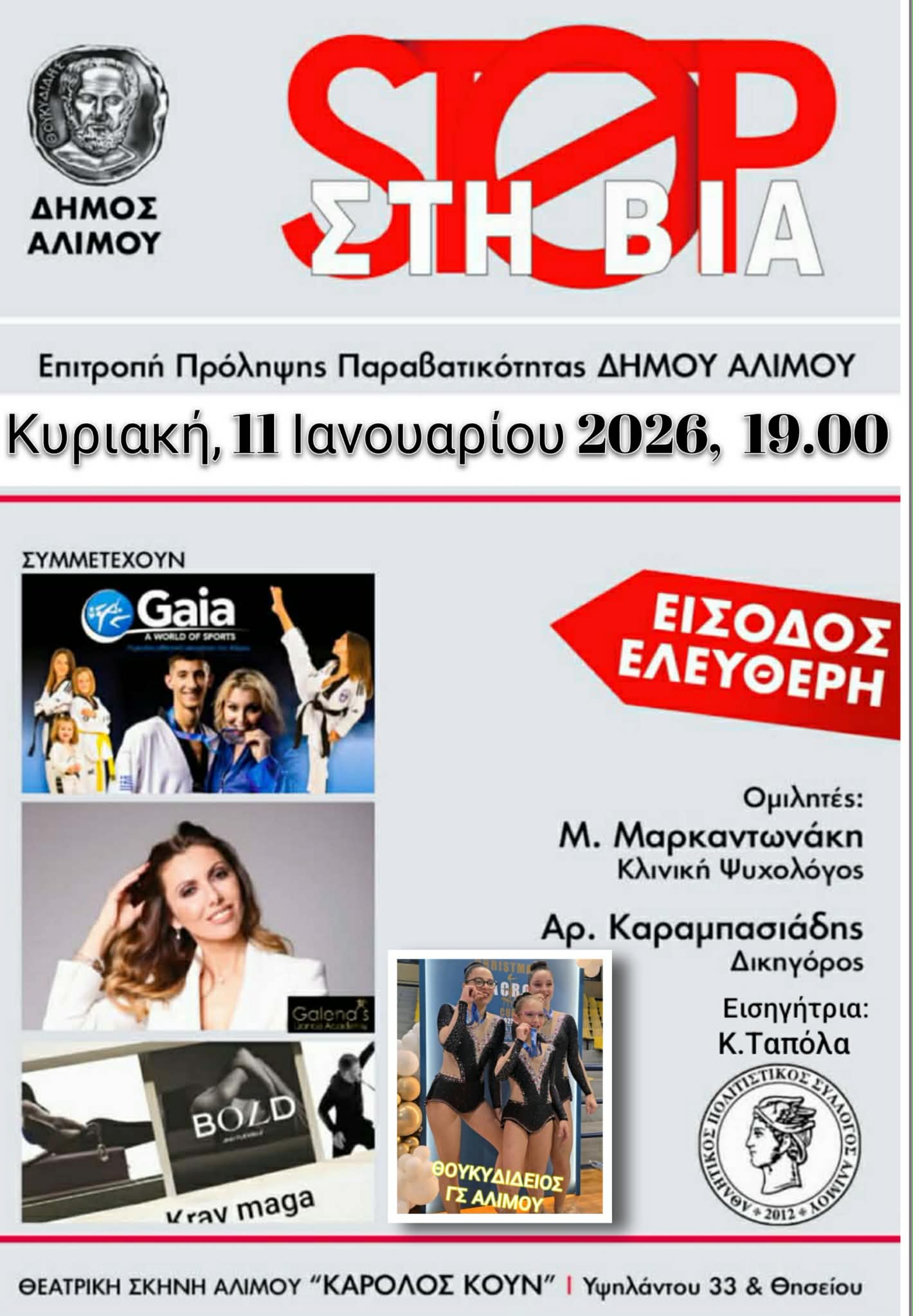 Η εκδήλωση θα πραγματοποιηθεί την Κυριακή 11 Ιανουαρίου και ώρα 19:00, στην Θεατρική Σκηνή «Καρόλου Κούν» (Υψηλάντου & Θησείου, Άλιμος), με ελέυθερη είσοδο.