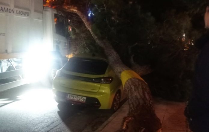 Ένα ογκώδες δέντρο ξεριζώθηκε και καταπλάκωσε απορριμματοφόρο και και σε σταθμευμένο όχημα στο Παλαιό Φάληρο, το βράδυ της Κυριακής (4/1), στη συμβολή των οδών Βενιζέλου και 28ης Οκτωβρίου, στην περιοχή της Κοψαχείλας.