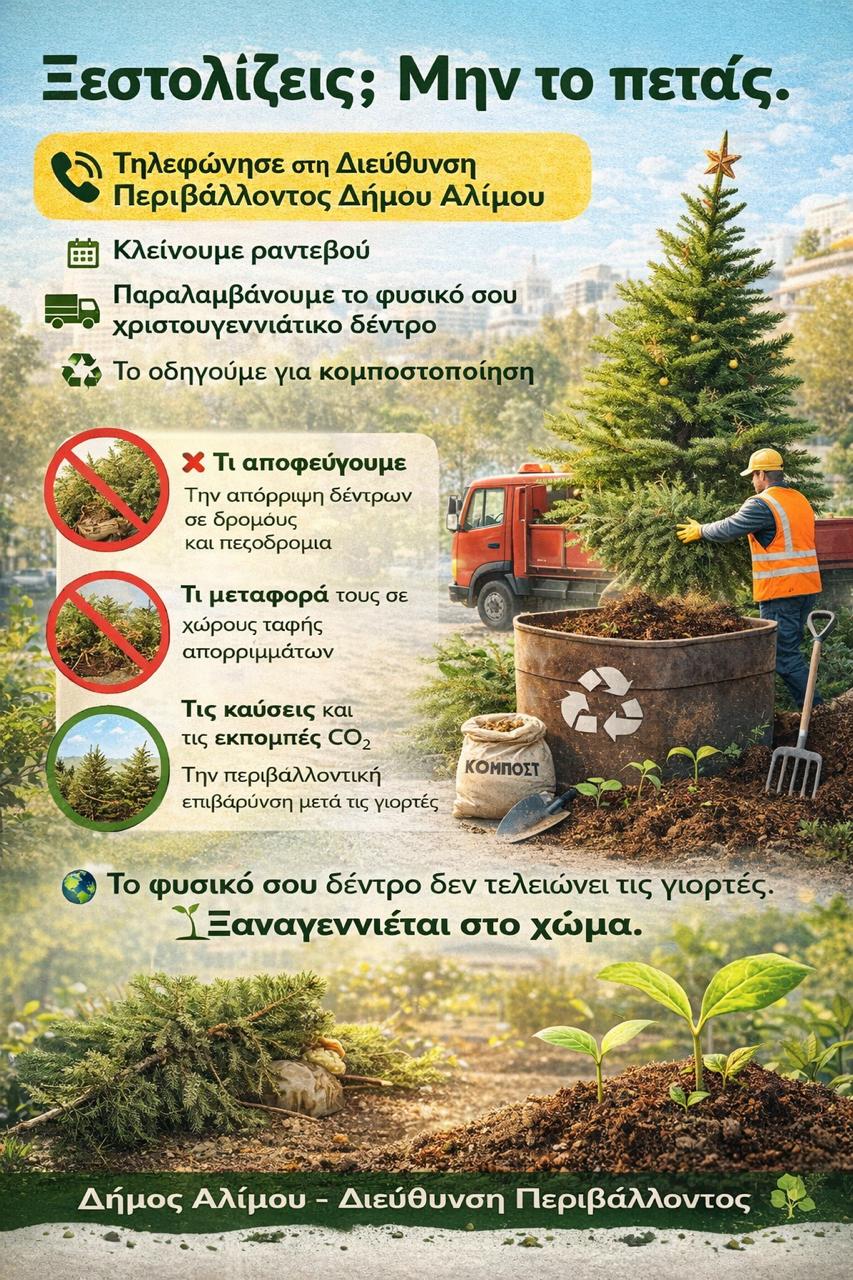 Με το πέρας των χριστουγεννιάτικων εορτών, ο Δήμος Αλίμου ανακοινώνει τη διοργάνωση ειδικής δράσης για την αποκομιδή και ανακύκλωση των φυσικών χριστουγεννιάτικων δέντρων, συμβάλλοντας ενεργά στην προστασία του περιβάλλοντος και στη μείωση των αποβλήτων.