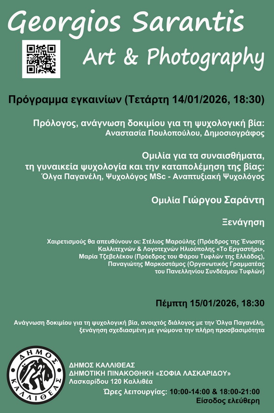 Η Δημοτική Πινακοθήκη Καλλιθέας «Σοφία Λασκαρίδου» φιλοξενεί μια ατομική έκθεση φωτογραφίας του Γιώργου Σαράντη, που δεν περιορίζεται μόνο στην απλή προβολή έργων, αλλά συνιστά μια ζωντανή, ξεχωριστή εμπειρία και αφήγηση ψυχής.