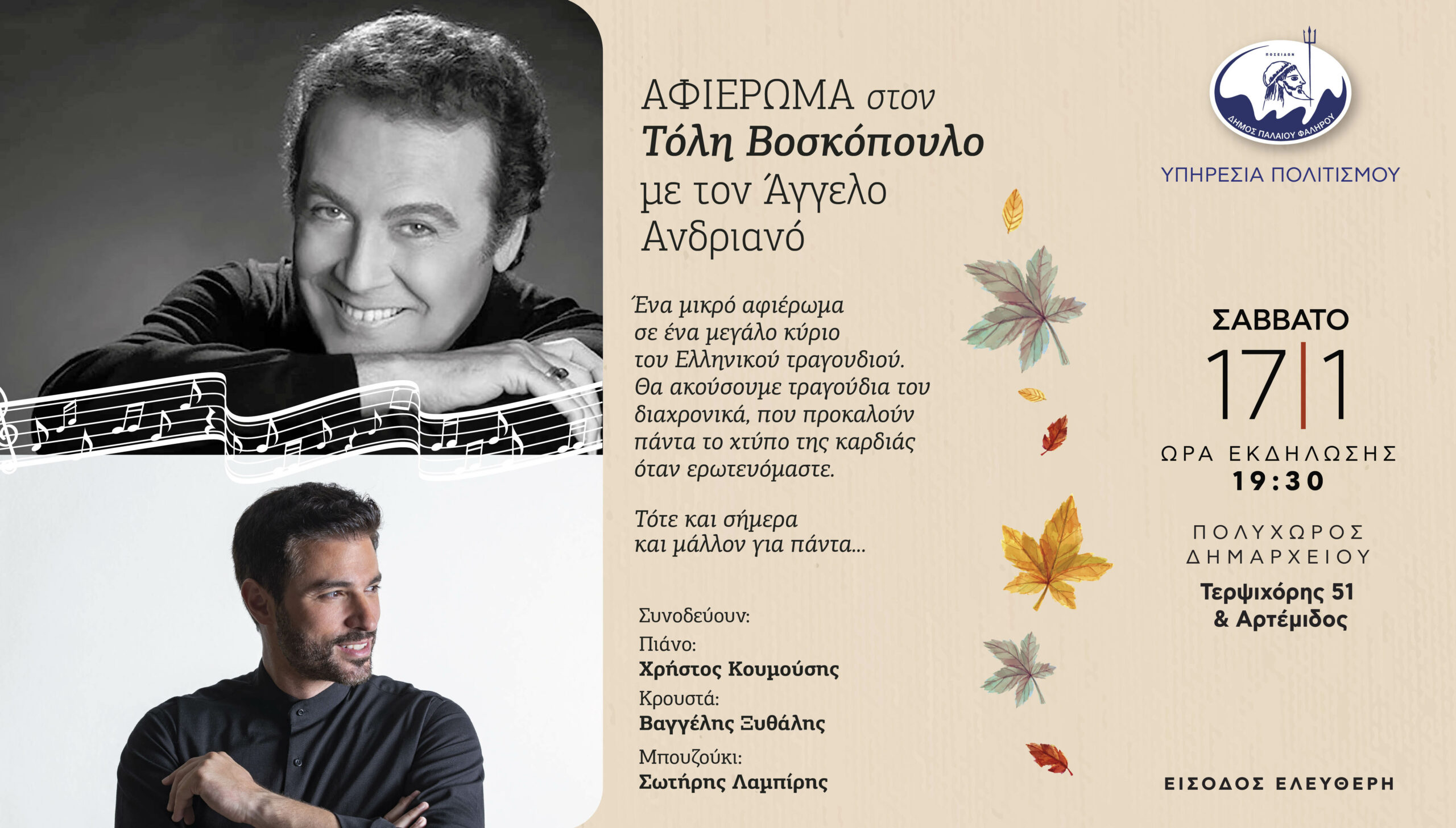 Ο Δήμος Παλαιού Φαλήρου τιμά τον Τόλη Βοσκόπουλο, έναν καλλιτέχνη που ανέδειξε το ελληνικό τραγούδι, με ένα μ ουσικό αφιέρωμα με τον τραγουδιστή Άγγελο Ανδριανό.