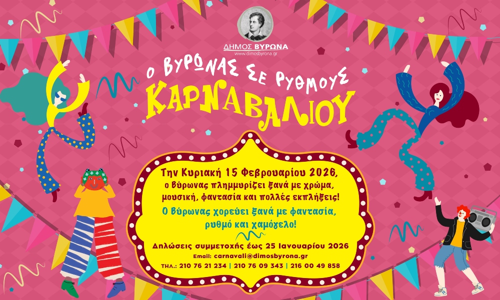 Το Καρναβάλι Βύρωνα 2026 μπαίνει στην τελική ευθεία και καλεί όλους τους δημότες να δηλώσουν συμμετοχή, στο πλαίσιο του προγραμματισμού και της οργάνωσης των αποκριάτικων εκδηλώσεων.