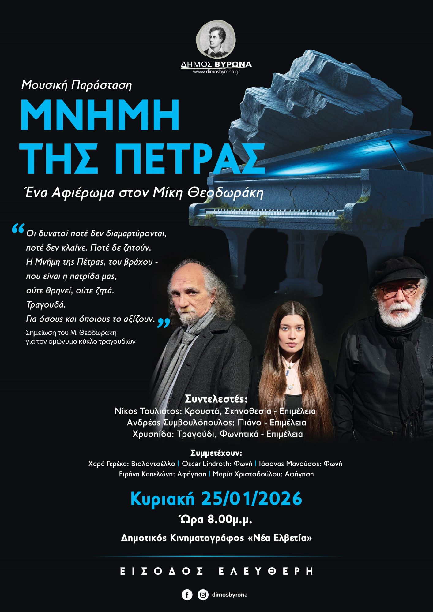 Ο Δήμος Βύρωνα παρουσιάζει τη μουσική παράσταση «Μνήμη της Πέτρας», ένα λιτό και βαθιά συγκινητικό αφιέρωμα στον Μίκη Θεοδωράκη, βασισμένο στον ομώνυμο κύκλο τραγουδιών του.