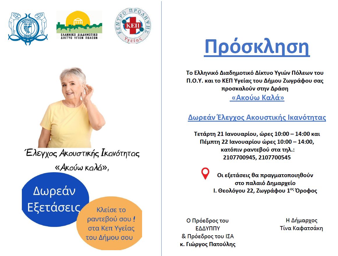 Το Ελληνικό Διαδημοτικό Δίκτυο Υγιών Πόλεων του Π.Ο.Υ. και το ΚΕΠ Υγείας του Δήμου Ζωγράφου διοργανώνουν μία δράση δωρεάν ελέγχου ακουστικής ικανότητας, με τίτλο «Ακούω Καλά».