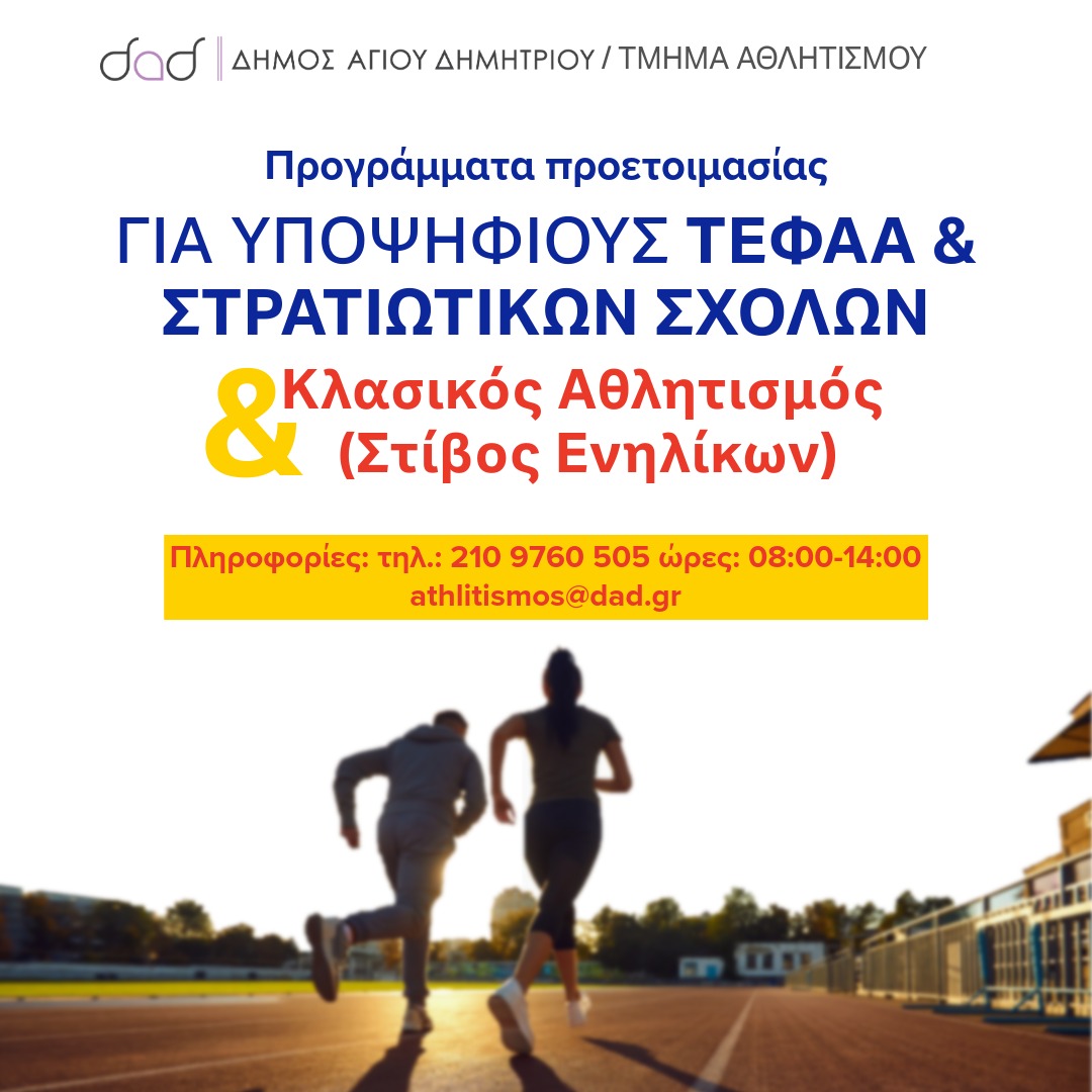 Την έναρξη τμημάτων προετοιμασίας για τους υποψηφίους μαθητές που στοχεύουν στα ΤΕΦΑΑ, τις Στρατιωτικές Σχολές και τα Σώματα Ασφαλείας ανακοίνωσε ο Δήμος και το Τμήμα Αθλητισμού Αγίου Δημητρίου.