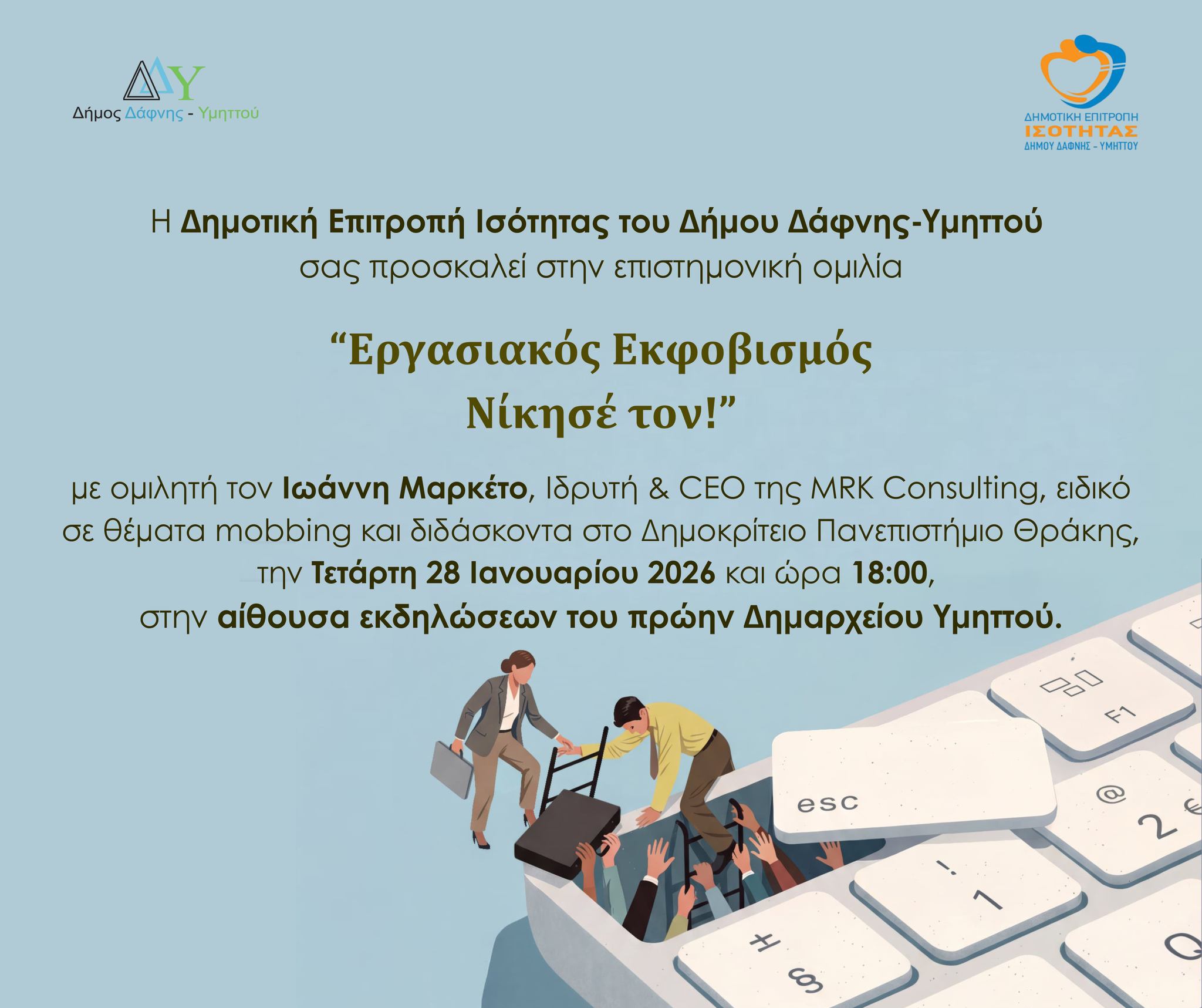 Μία επιστημονική ομιλία με θέμα «Εργασιακός Εκφοβισμός: Νίκησέ τον!» διοργανώνει η Δημοτική Επιτροπή Ισότητας του Δήμου Δάφνης-Υμηττού.