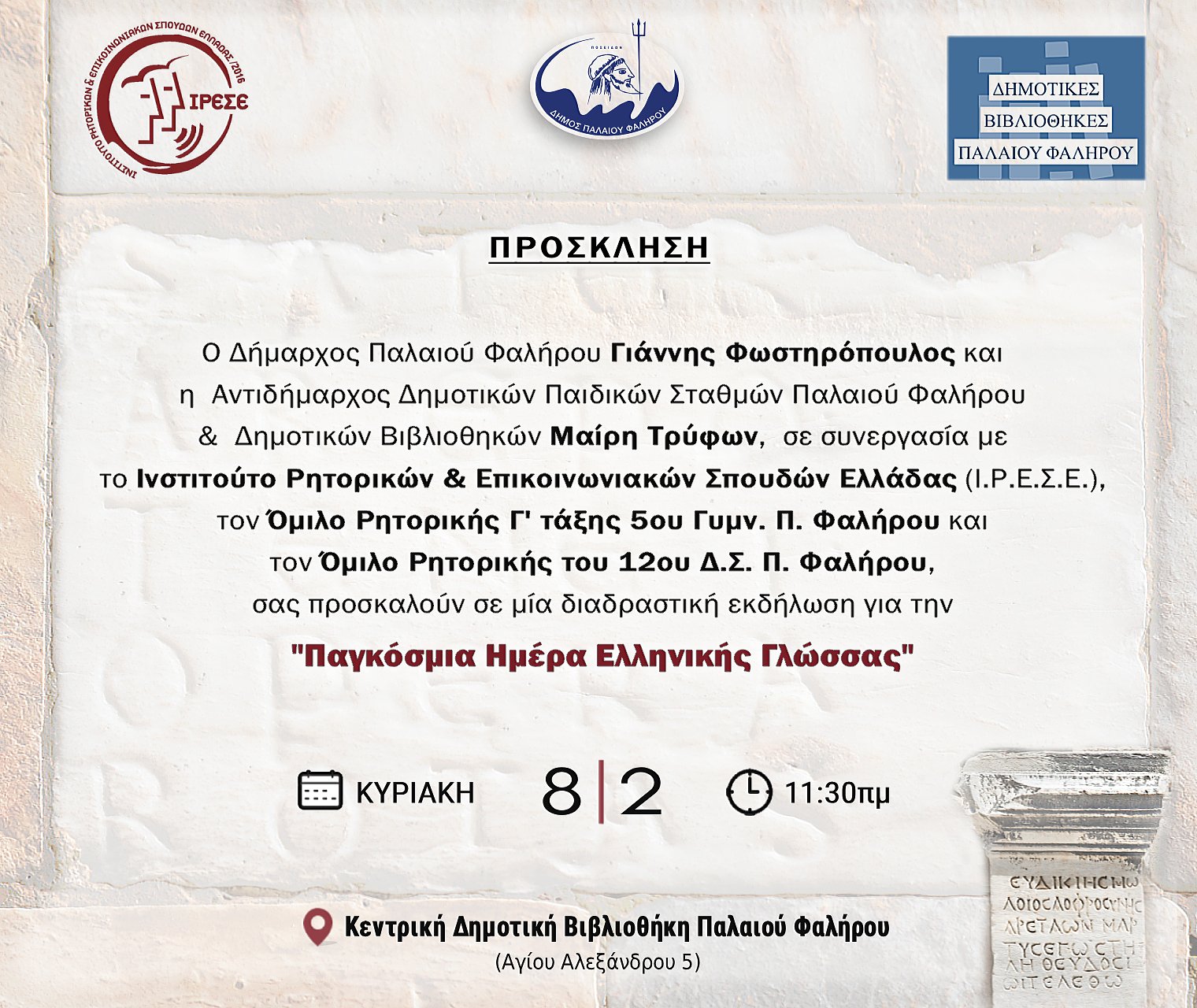 Με αφορμή την Παγκόσμια Ημέρα Ελληνικής Γλώσσας, ο Δήμος Παλαιού Φαλήρου διοργανώνει μία διαδραστική εκδήλωση σε συνεργασία με το Ινστιτούτο Ρητορικών & Επικοινωνιακών Σπουδών Ελλάδας (ΙΡΕΣΕ), τον Όμιλο Ρητορικής Γ’ τάξης του 5ου Γυμνασίου Παλαιού Φαλήρου και τον Όμιλο Ρητορικής του 12ου Δ.Σ. Παλαιού Φαλήρου.