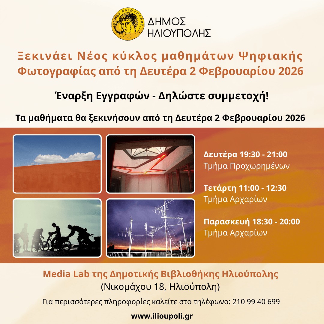 Τα μαθήματα θα ξεκινήσουν, από τη Δευτέρα 2 Φεβρουαρίου 2026 και θα πραγματοποιούνται στο Media Lab της Δημοτικής Βιβλιοθήκης Ηλιούπολης (Νικομάχου 18).