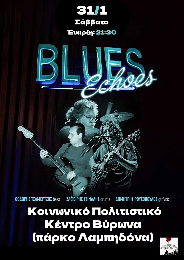 Το Κοινωνικό Πολιτιστικό Κέντρο του Βύρωνα διοργανώνει μία συναυλία με τους Blues Echoes, ένα συκρότημα με πολυδιάστατο ήχο που ενσωματώνει στοιχεία από το blues, την jazz, το ragtime, το swing, καθώς και τους ήχους του Μississippi και του Chicago.