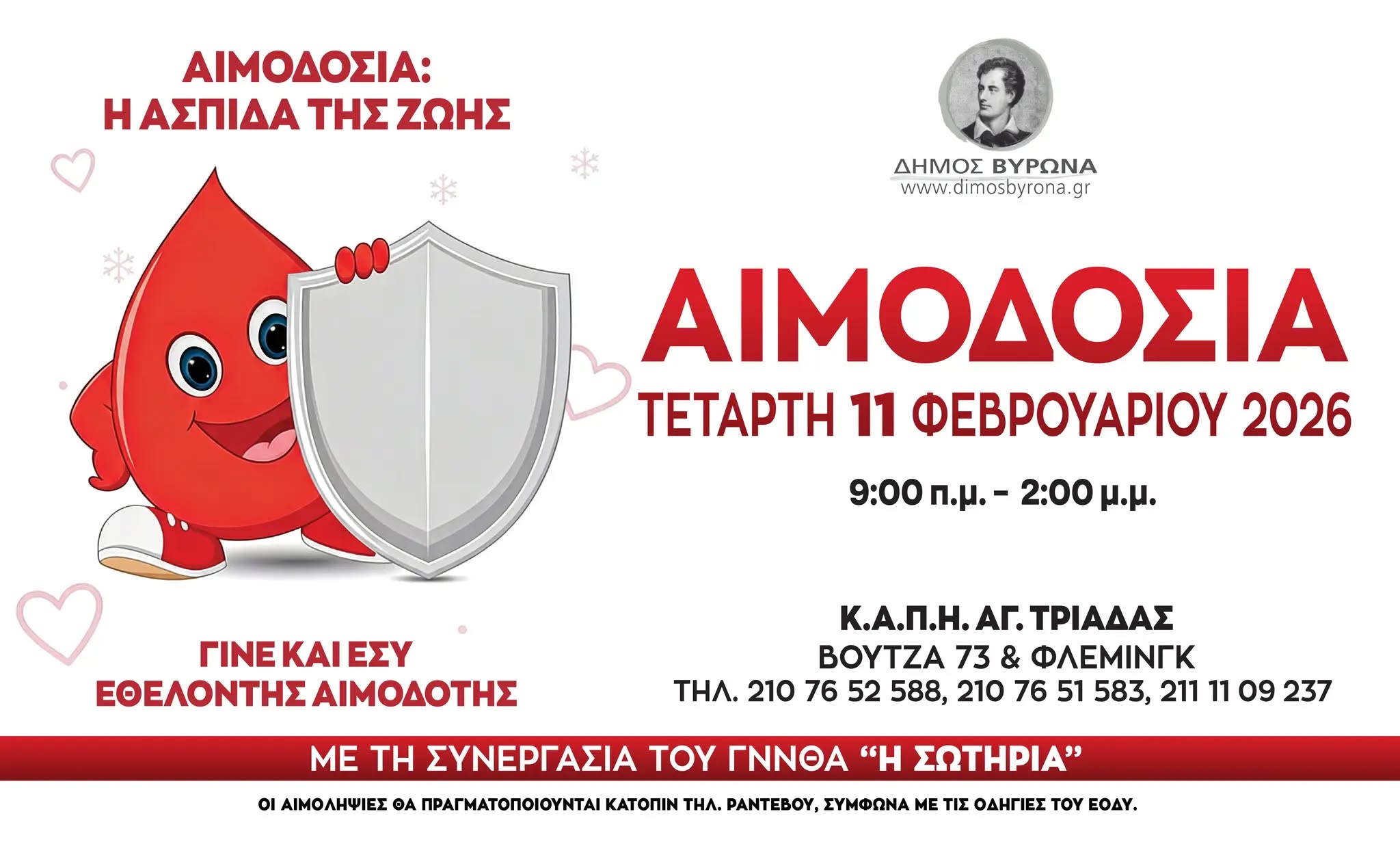 Εθελοντική αιμοδοσία στον Δήμο Βύρωνα – «Μια στάση αγάπης, μια ασπίδα ζωής»