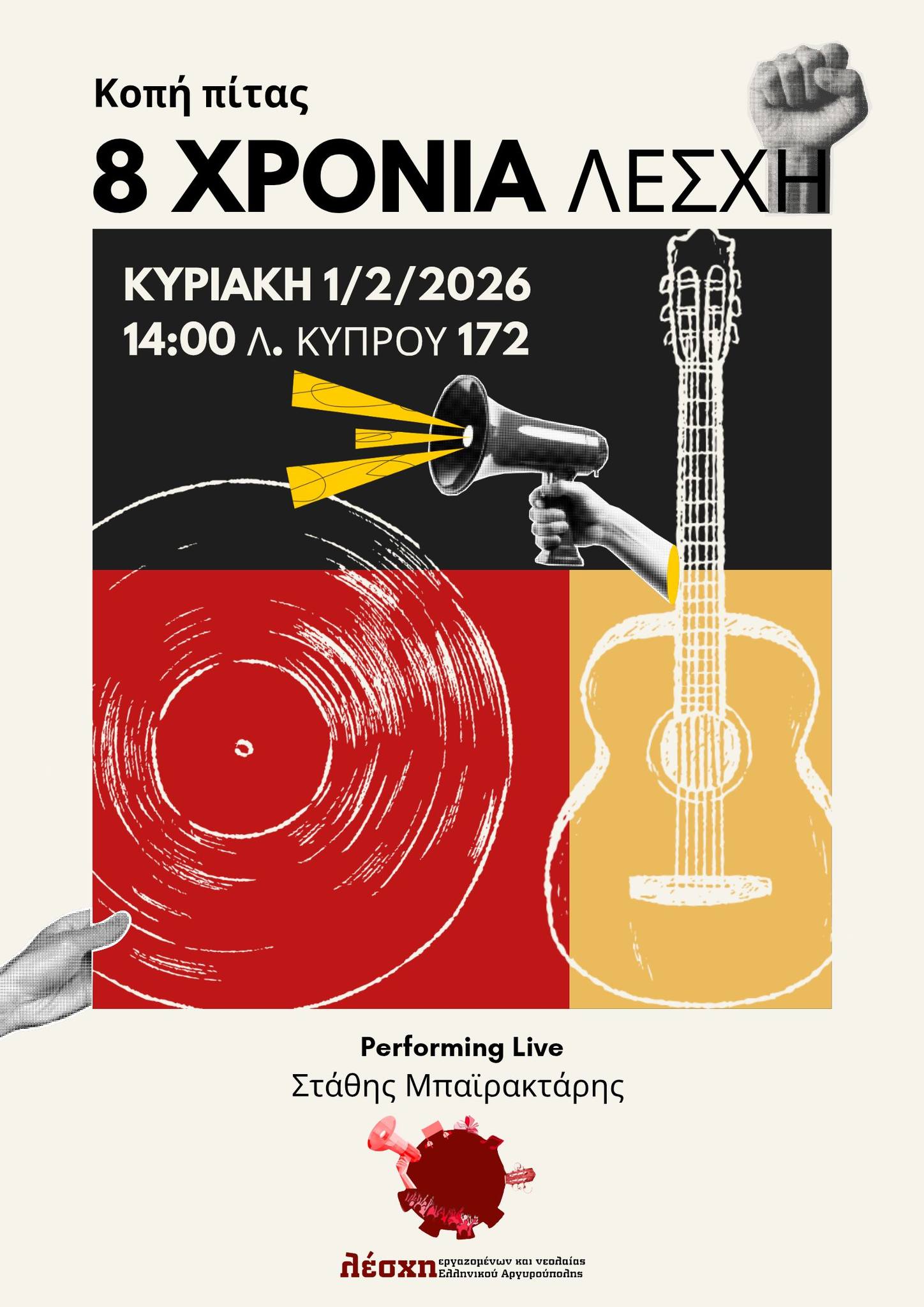 Η Λέσχη Εργαζομένων και Νεολαίας Ελληνικού Αργυρούπολης συμπληρώνει 8 χρόνια ζωής και διοργανώνει μία εκδήλωση για να το γιορτάζσει με όλα τα μέλη και τους φίλους της.