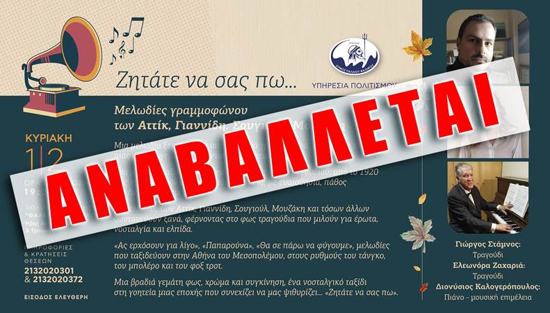 Η εκδήλωση «Ζητάτε να σας πω…», που ήταν προγραμματισμένη για την Κυριακή 1η Φεβρουαρίου και ώρα 19:30 στο Πολιτιστικό Κέντρο «Θάλεια Διπλαράκου» αναβάλλεται,  λόγω πρόβλεψης έντονων βροχοπτώσεων και καταιγίδων μέσα στο Σαββατοκύριακο.