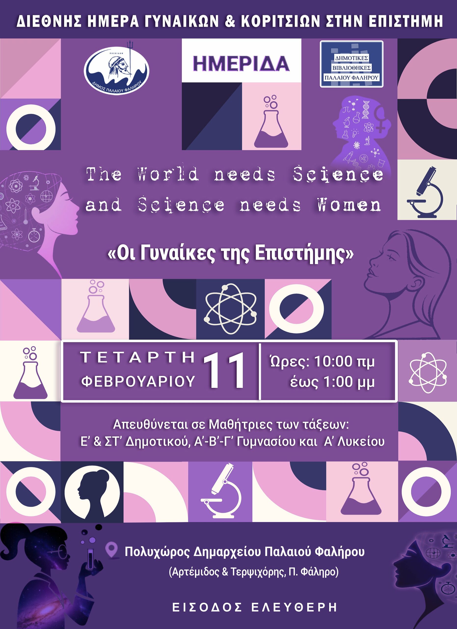 Στο πλαίσιο αυτής της επετείου, ο Δήμος Παλαιού Φαλήρου, με τις Δημοτικές Βιβλιοθήκες Παλαιού Φαλήρου και το Τμήμα Παιδείας, διοργανώνουν ημερίδα, την Τετάρτη 11 Φεβρουαρίου, στον Πολυχώρο του Δημαρχείου (Αρτέμιδος 51 & Τερψιχόρης) με στόχο την ευαισθητοποίηση και την ενθάρρυνση των νεαρών κοριτσιών /μαθητριών στους τομείς STEM (Science, Technology, Engineering, Mathematics).
