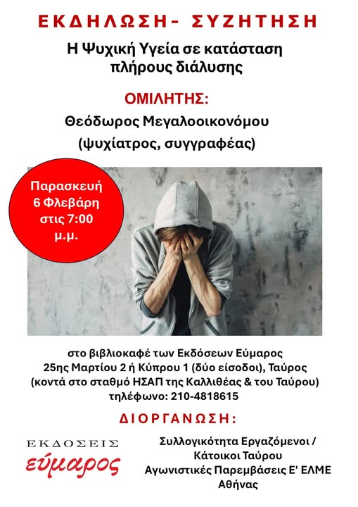 Μία εκδήλωση-συζήτηση με θέμα «Η Ψυχική Υγεία σε κατάσταση πλήρους διάλυσης» θα πραγματοποιηθεί στον Ταύρο, με ομιλητή τον ψυχίατρο και συγγραφέα Θεόδωρο Μεγαλοοικονόμου.