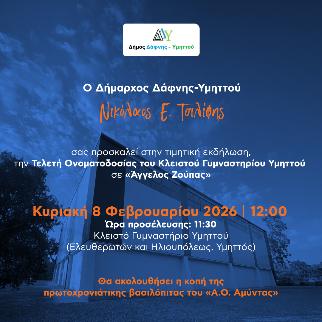Την Κυριακή 8 Φεβρουαρίου 2026, στις 12:00, στο Κλειστό Γυμναστήριο Υμηττού, στη συμβολή των οδών Ελευθερωτών και Ηλιουπόλεως, θα λάβει χώρα η τελετή ονοματοδοσίας του γυμναστηρίου σε «Άγγελος Ζούπας».