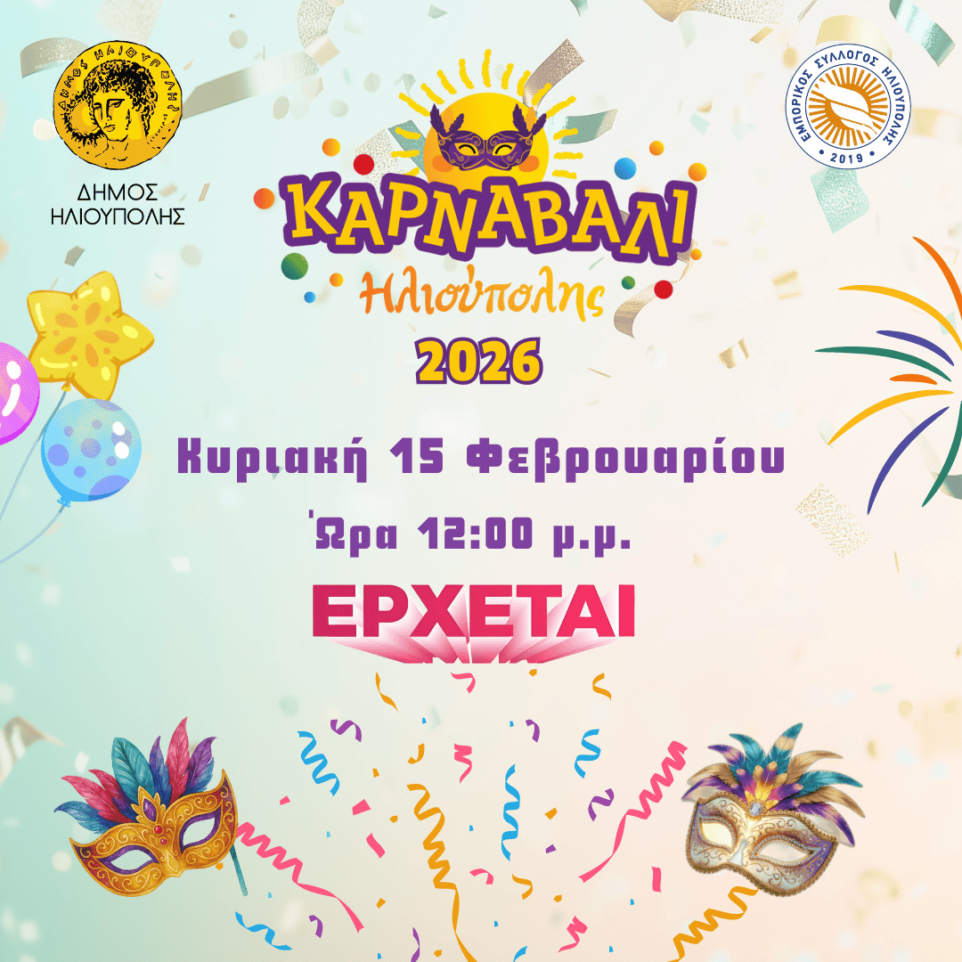 Το Καρναβάλι της Ηλιούπολης θα πραγματοποιηθεί την Κυριακή 15 Φεβρουαρίου 2026. Το πρόγραμμα περιλαμβάνει εκπλήξεις, καλλιτεχνικές παρουσίες και δράσεις που θα ενθουσιάσουν μικρούς και μεγάλους, μετατρέποντας την πόλη σε μια γιορτή ανοιχτή για όλους.