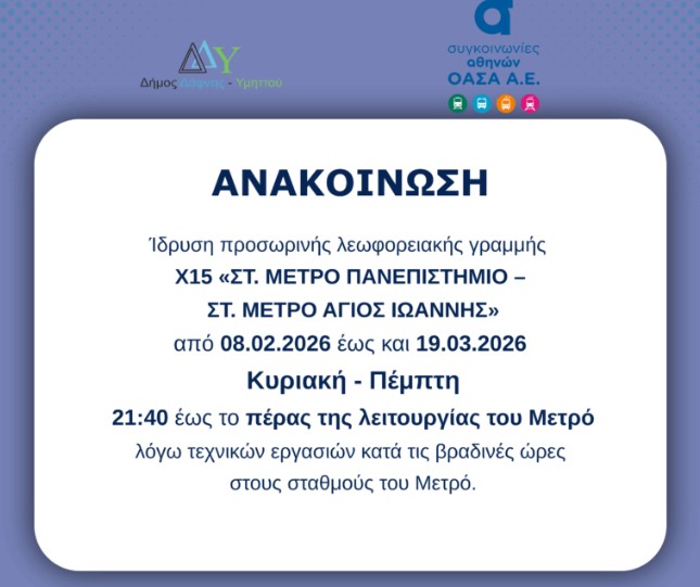 Η προσωρινή λεωφορειακή γραμμή Χ15 «ΣΤ. ΜΕΤΡΟ ΠΑΝΕΠΙΣΤΗΜΙΟ – ΣΤ. ΜΕΤΡΟ ΑΓΙΟΣ ΙΩΑΝΝΗΣ» έχει τεθεί ήδη σε λειτουργία από τις 8 Φεβρουαρίου και θα παραμείνει σε ισχύ μέχρι και τις 19 Μαρτίου.